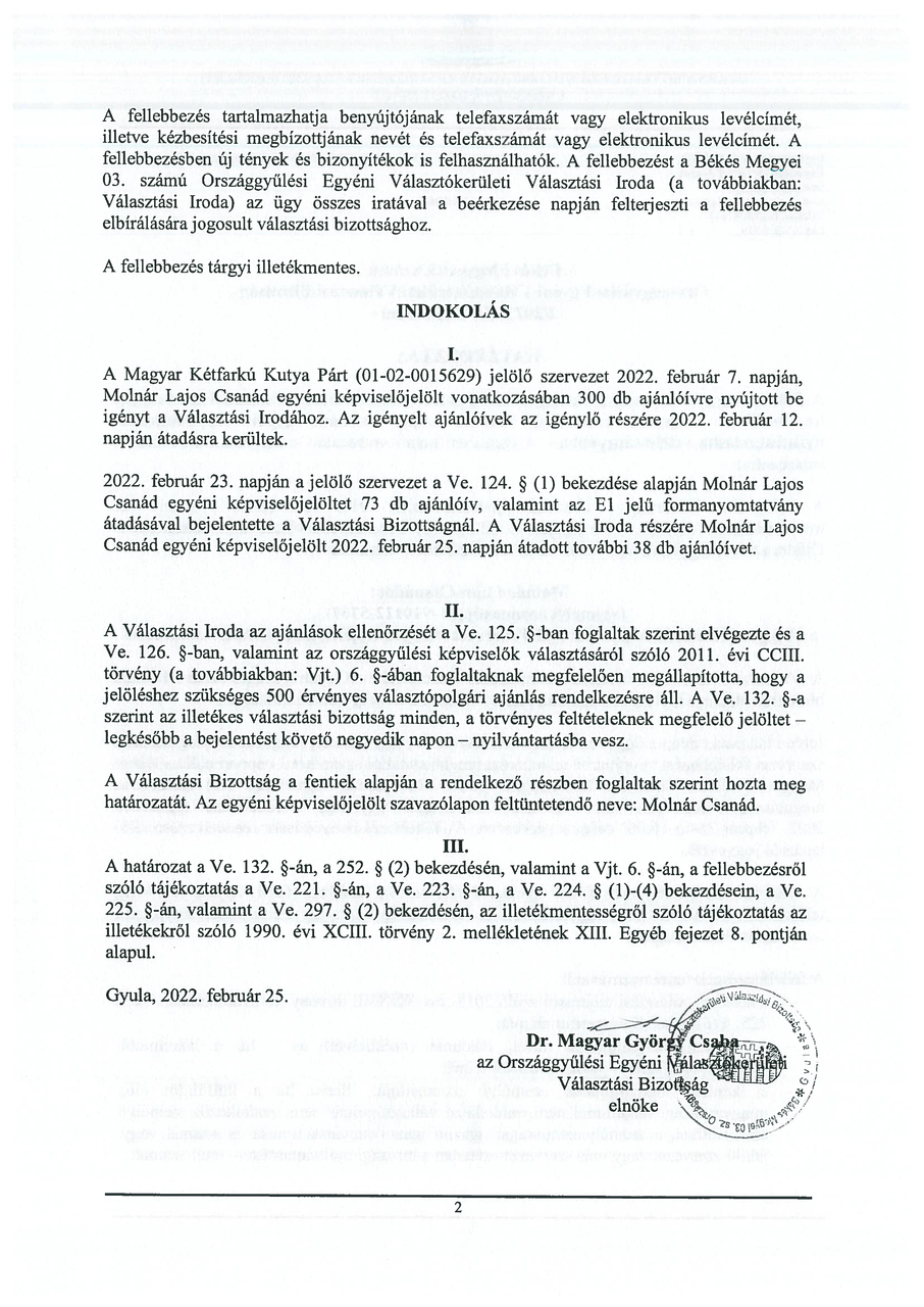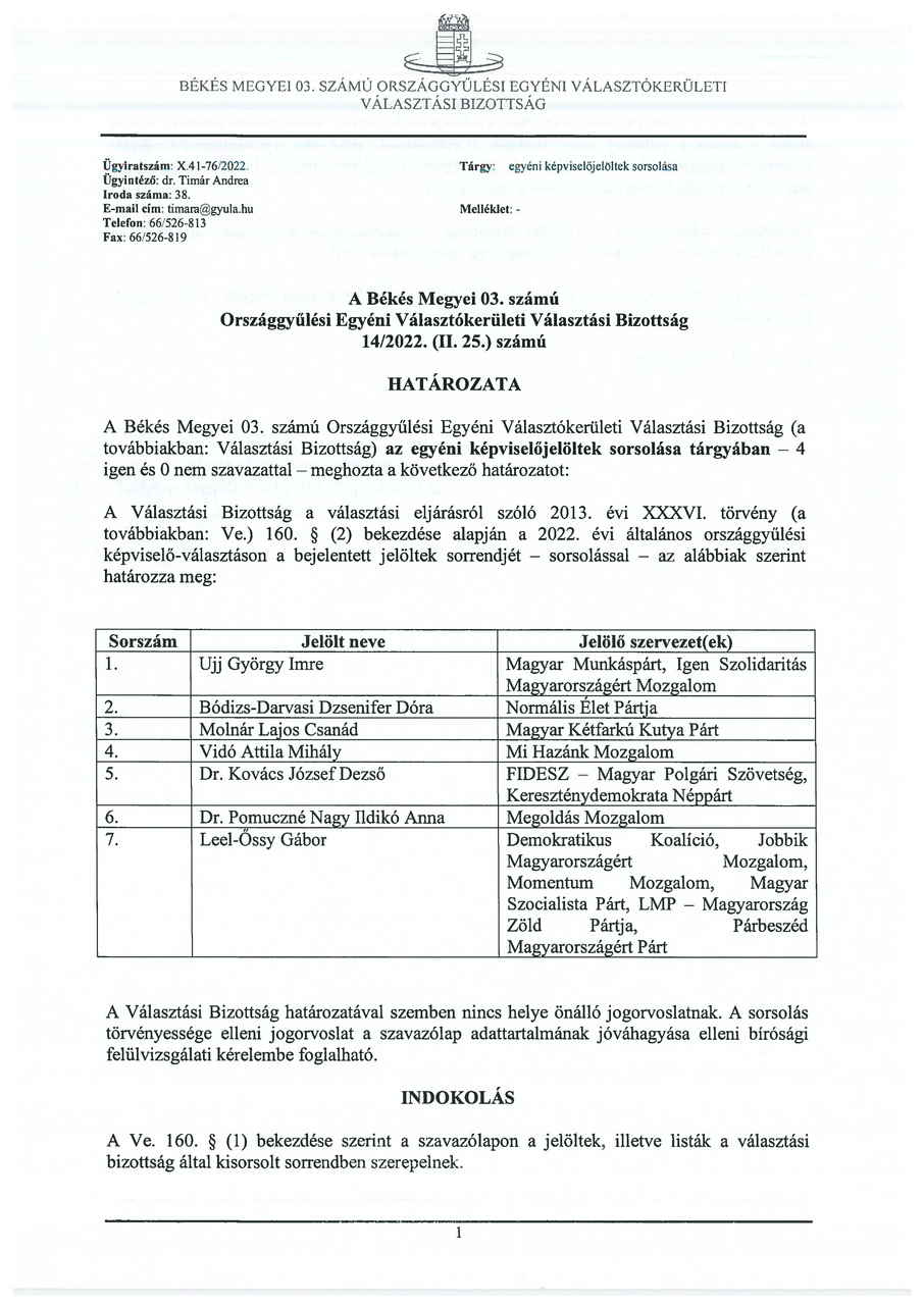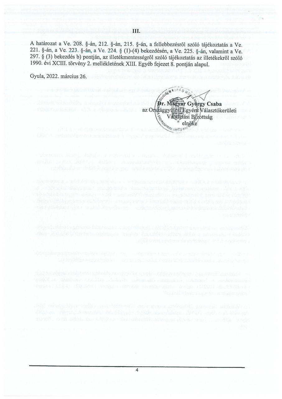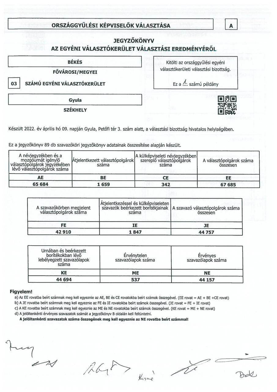 A Békés Megyei 03. Számú Országgyűlési Egyéni Választókerületi Választási Bizottság Dr. Magyar György Csabát a bizottság elnökének, Dr. Varga Lillát a bizottság elnökhelyettesének megválasztotta.