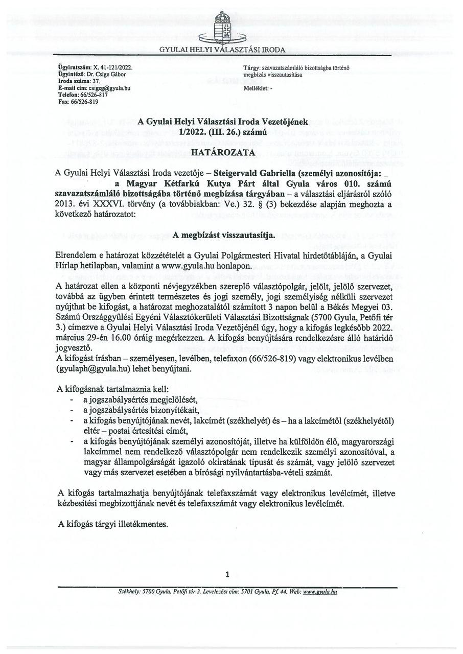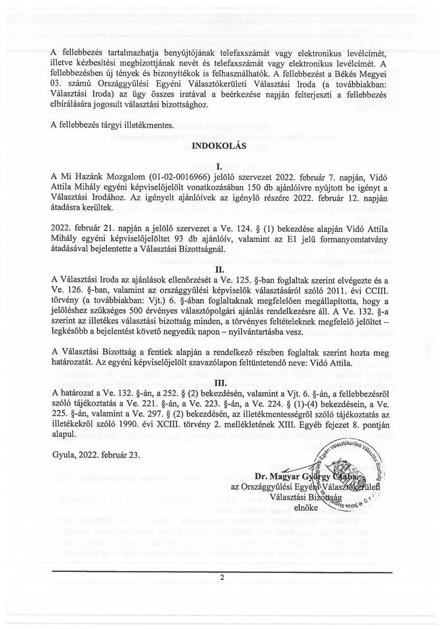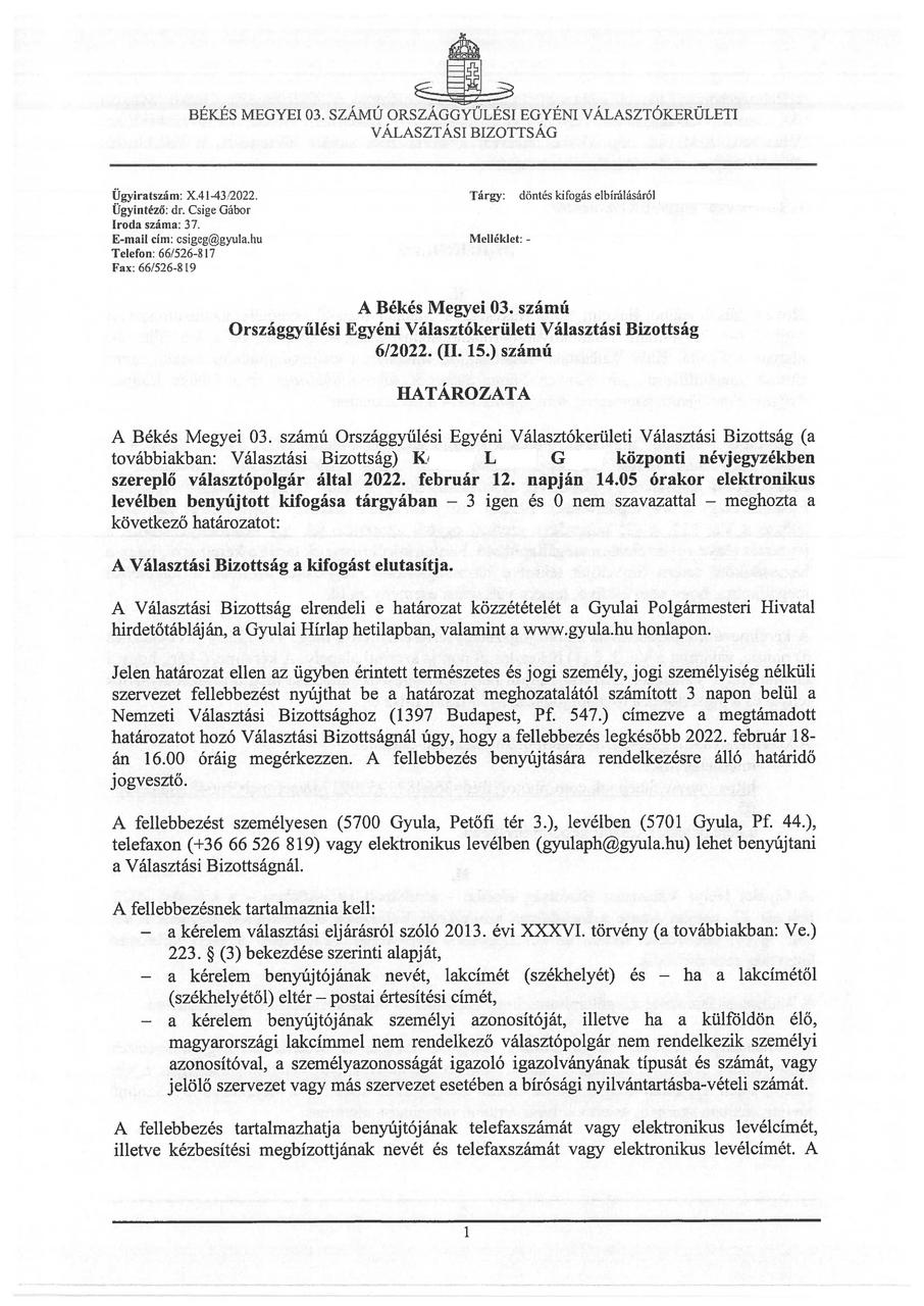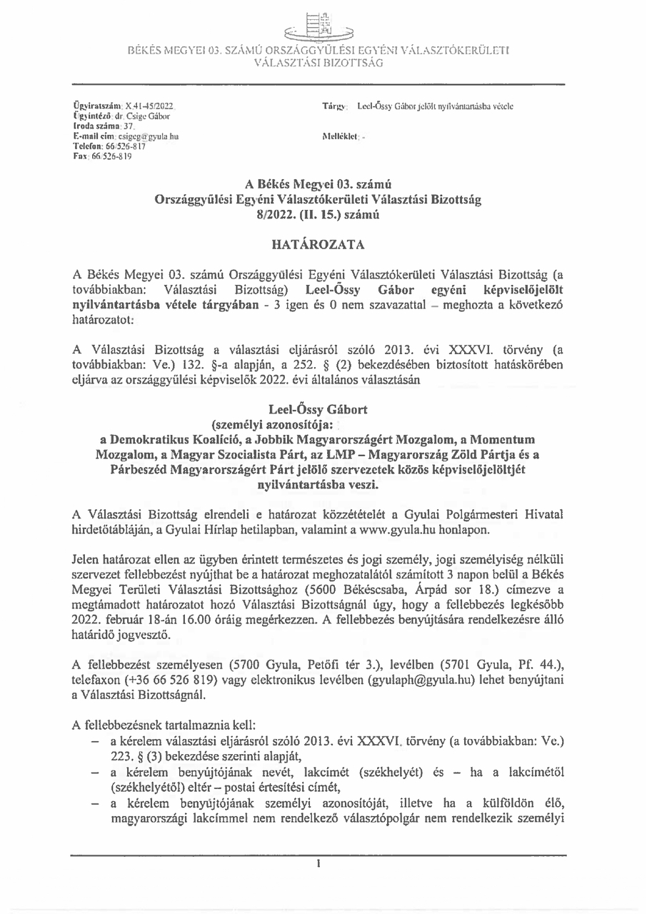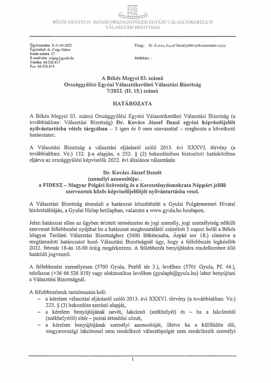 A Békés Megyei 03. Számú Országgyűlési Egyéni Választókerületi Választási Bizottság Dr. Magyar György Csabát a bizottság elnökének, Dr. Varga Lillát a bizottság elnökhelyettesének megválasztotta.