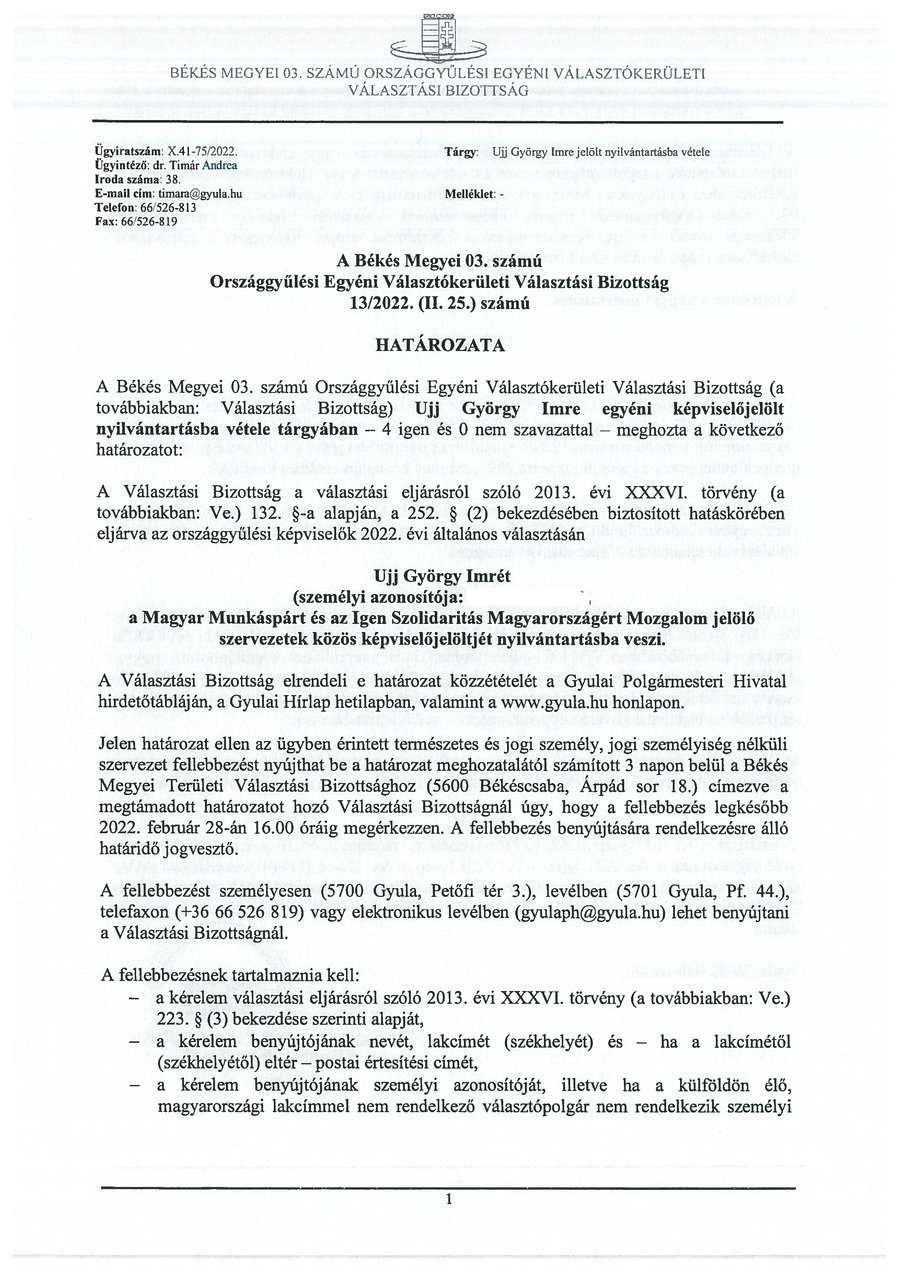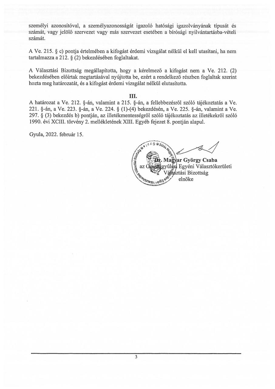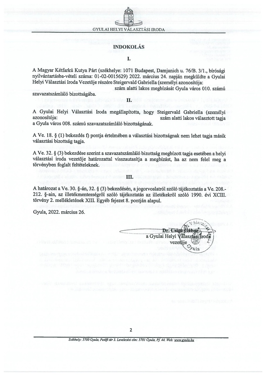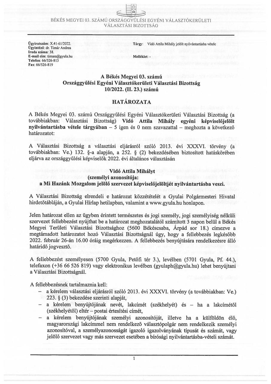 A Békés Megyei 03. Számú Országgyűlési Egyéni Választókerületi Választási Bizottság Dr. Magyar György Csabát a bizottság elnökének, Dr. Varga Lillát a bizottság elnökhelyettesének megválasztotta.