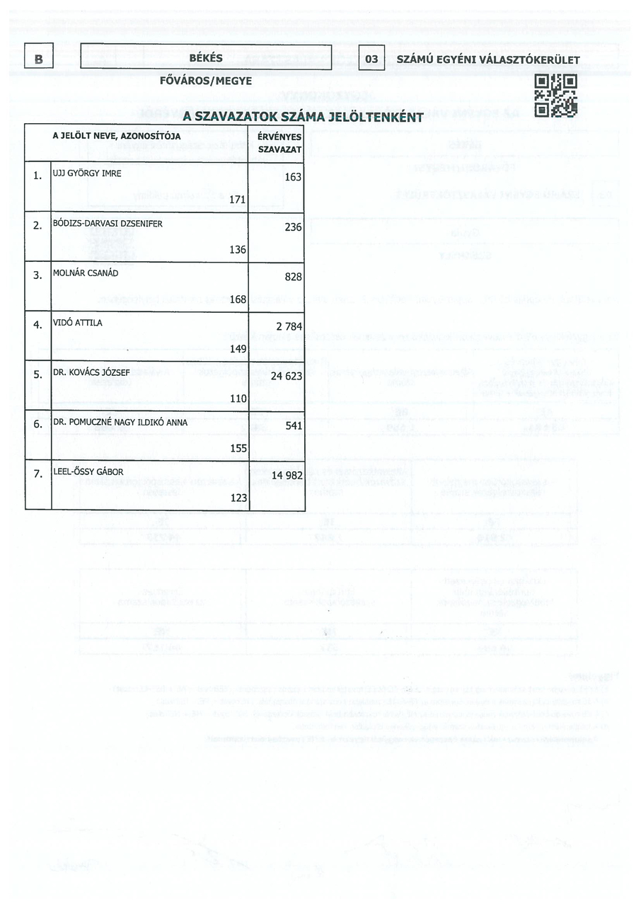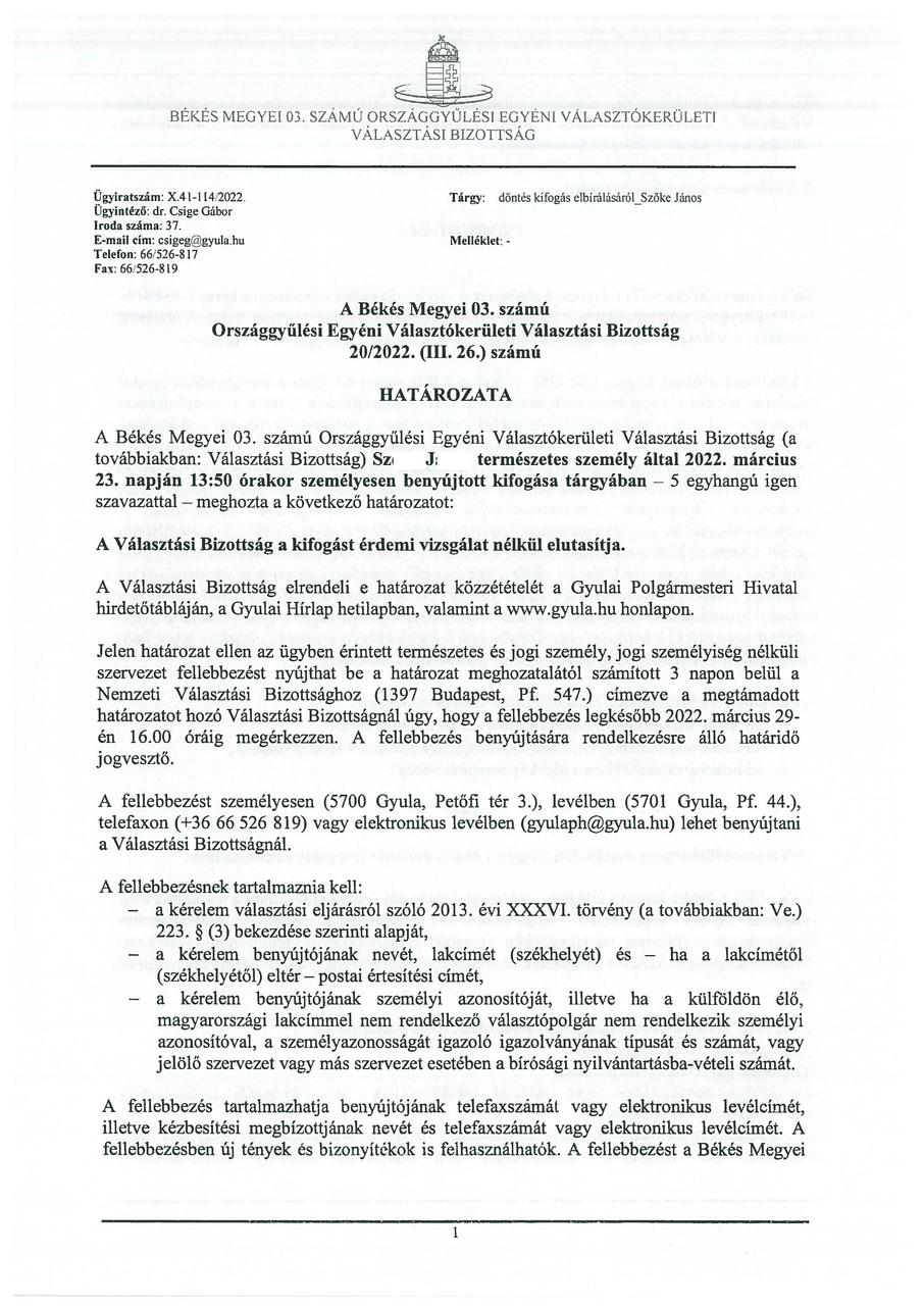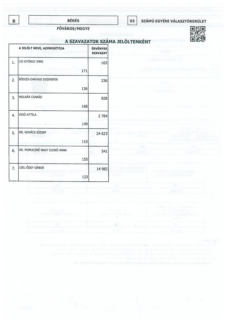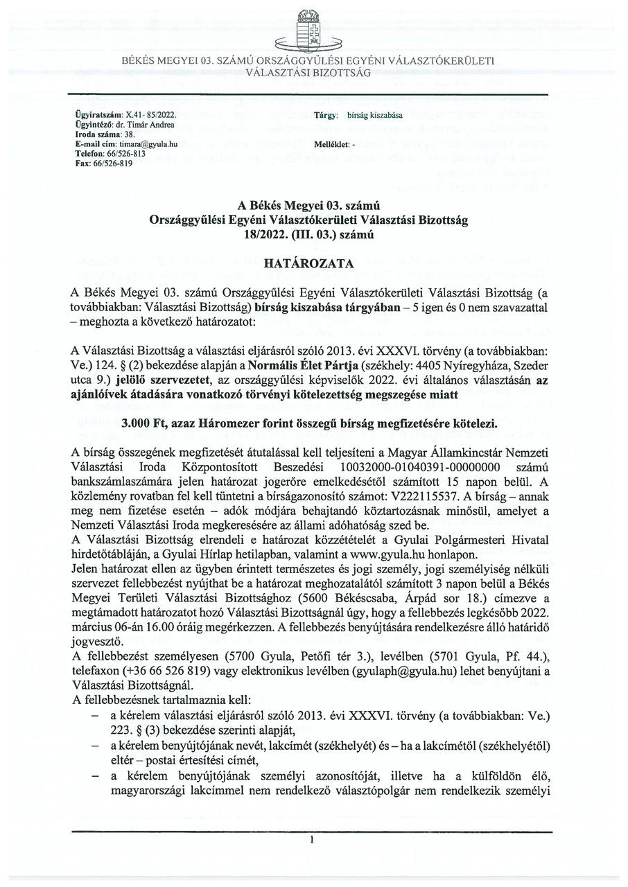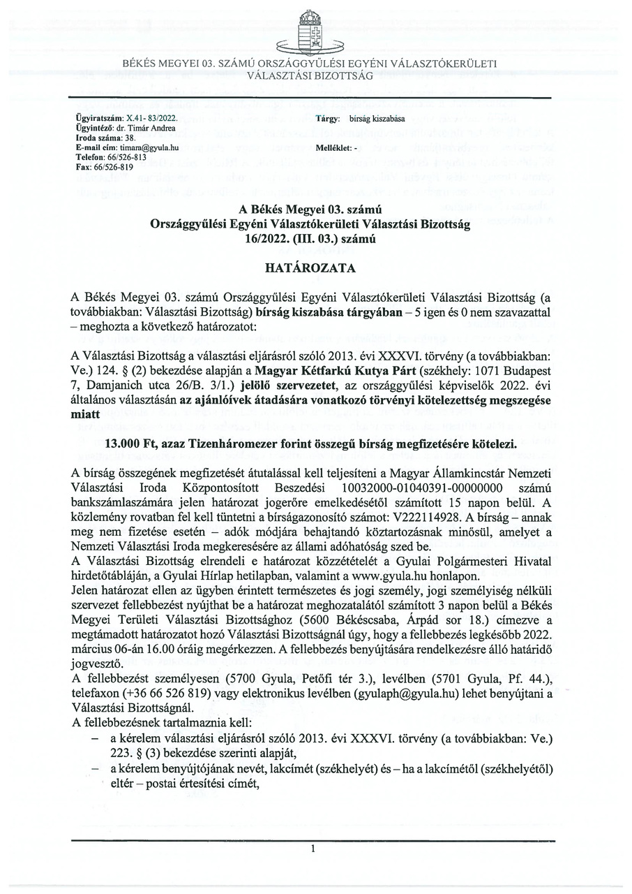 A Békés Megyei 03. Számú Országgyűlési Egyéni Választókerületi Választási Bizottság Dr. Magyar György Csabát a bizottság elnökének, Dr. Varga Lillát a bizottság elnökhelyettesének megválasztotta.