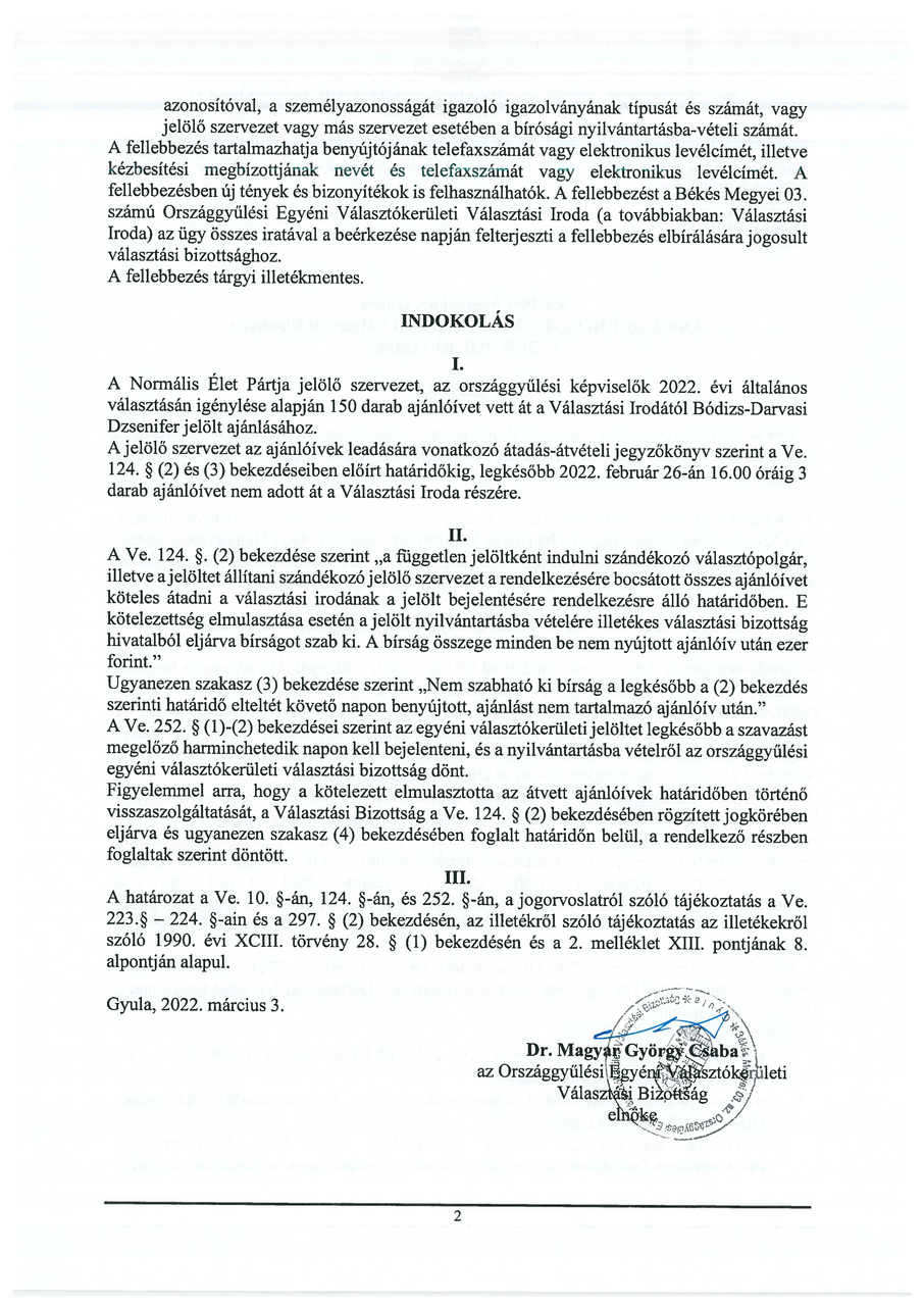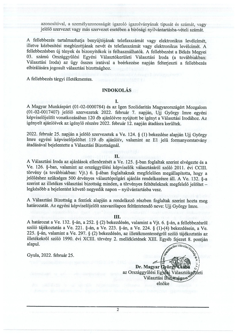 - a választási bizottság elnökének aláírását és a választási bizottság bélyegzőlenyomatát.