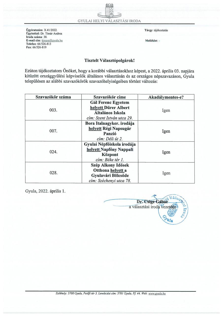 Ezúton tájékoztatom a Tisztelt Választópolgárokat, hogy a 2022. április 03. napjára kitűzött országgyűlési képviselők általános választásán és az országos népszavazáson, Gyula településen az alábbi szavazókörökben adhatják le szavazataikat: