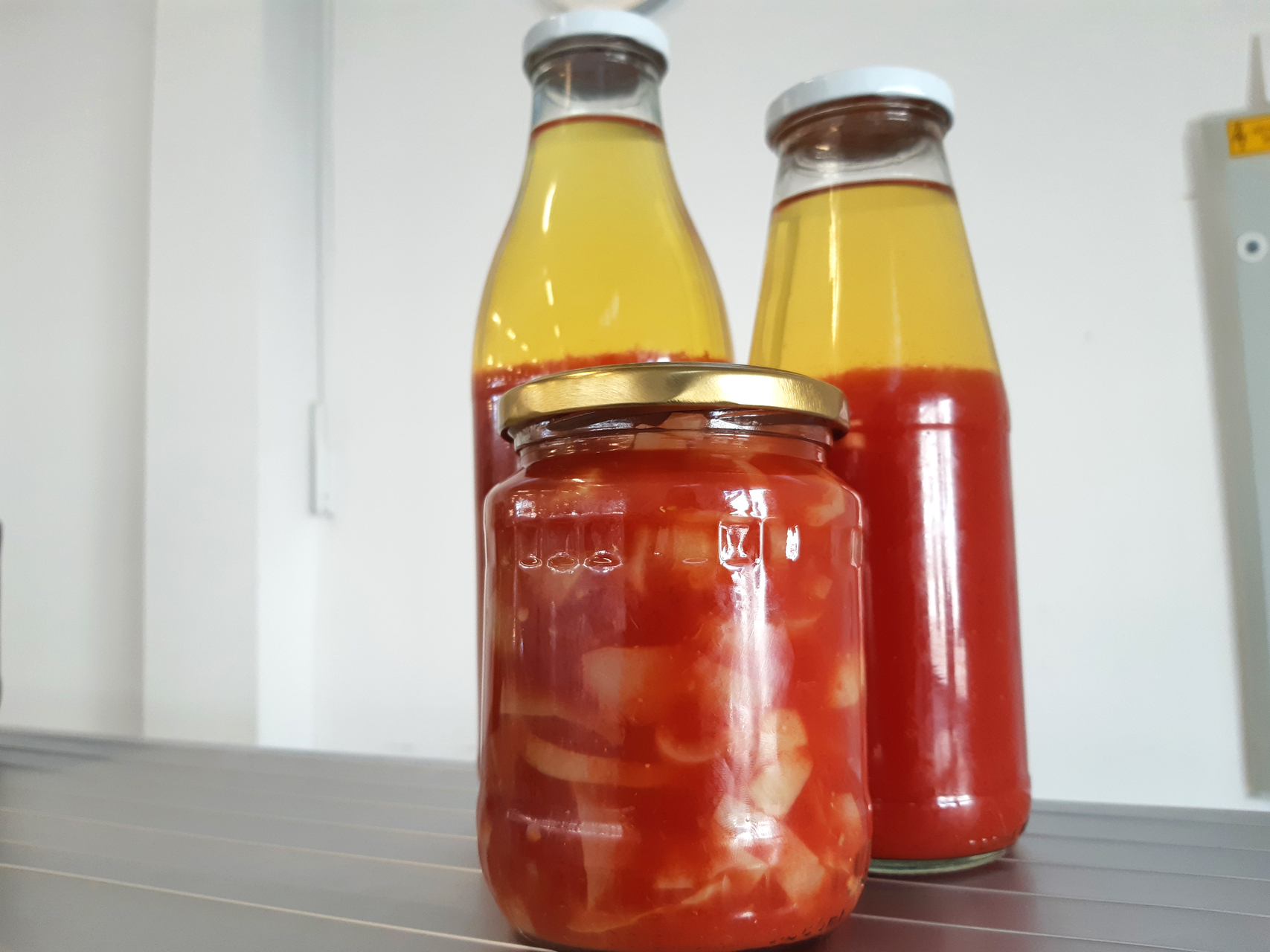 Lecsó, paradicsomban eltett egész paprika és natúr paradicsomlé is kapható a gyulai piac csarnokában.