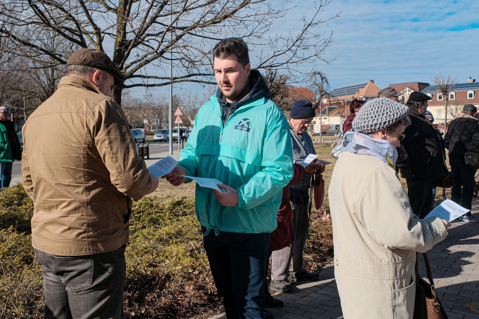 Fórumot tartott Márki-Zay Péter, az ellenzék miniszterelnök-jelöltje február 18-án Gyulán, az 1-es posta épülete előtt.