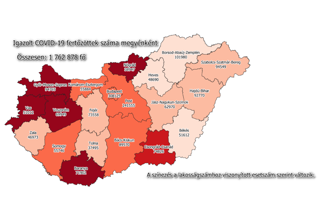 A koronavirus.gov.hu oldal térképe szerint eddig Budapesten (308 125) és Pest megyében (241 555) regisztrálták a legtöbb fertőzöttet. Ezt követi Borsod-Abaúj-Zemplén (101 980), Győr-Moson-Sopron (94 765), Szabolcs-Szatmár-Bereg (94 549), Hajdú-Bihar (92 770) és Bács-Kiskun megye (89 570). A fertőzéssel legkevésbé érintett megye továbbra is Tolna (37 495).