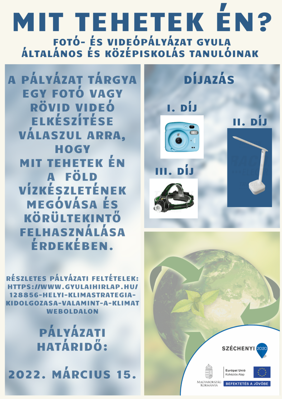A pályaműveket a kehop_gyula@dipolcsoport.hu e-mail-címre várják, Mit tehetek én? tárgymegjelöléssel, nagyméretű dokumentum küldésére alkalmas fájlátviteli szolgáltatás (pl. WeTransfer) használatával. A pályázatokat 2022. március 15-én 23 óra 59 percig lehet benyújtani. Az eredmények kihirdetésére és a díjak átadására a víz világnapján, 2022. március 22-én kerül sor, a részletekről a díjazottakat a pályázat szervezője külön értesíti. További részletek itt találhatók: https://www.gyulaihirlap.hu/128856-helyi-klimastrategia-kidolgozasa-valamint-a-klimat.