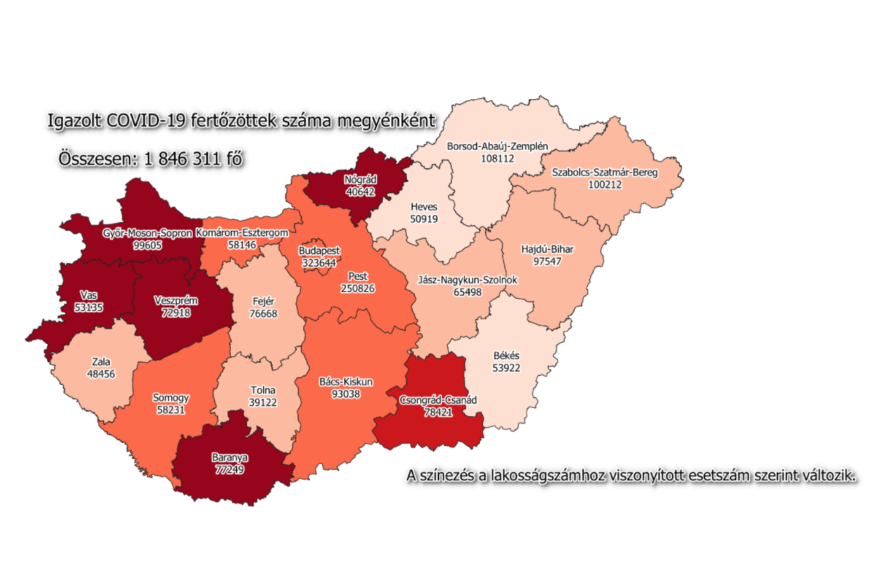 A koronavirus.gov.hu oldal térképe szerint eddig Budapesten (323 644) és Pest megyében (250 826) regisztrálták a legtöbb fertőzöttet. Ezt követi Borsod-Abaúj-Zemplén (108 112), Szabolcs-Szatmár-Bereg (100 212), Győr-Moson-Sopron (99 605), Hajdú-Bihar (97 547) és Bács-Kiskun megye (93 038). A fertőzéssel legkevésbé érintett megye továbbra is Tolna (39 122).