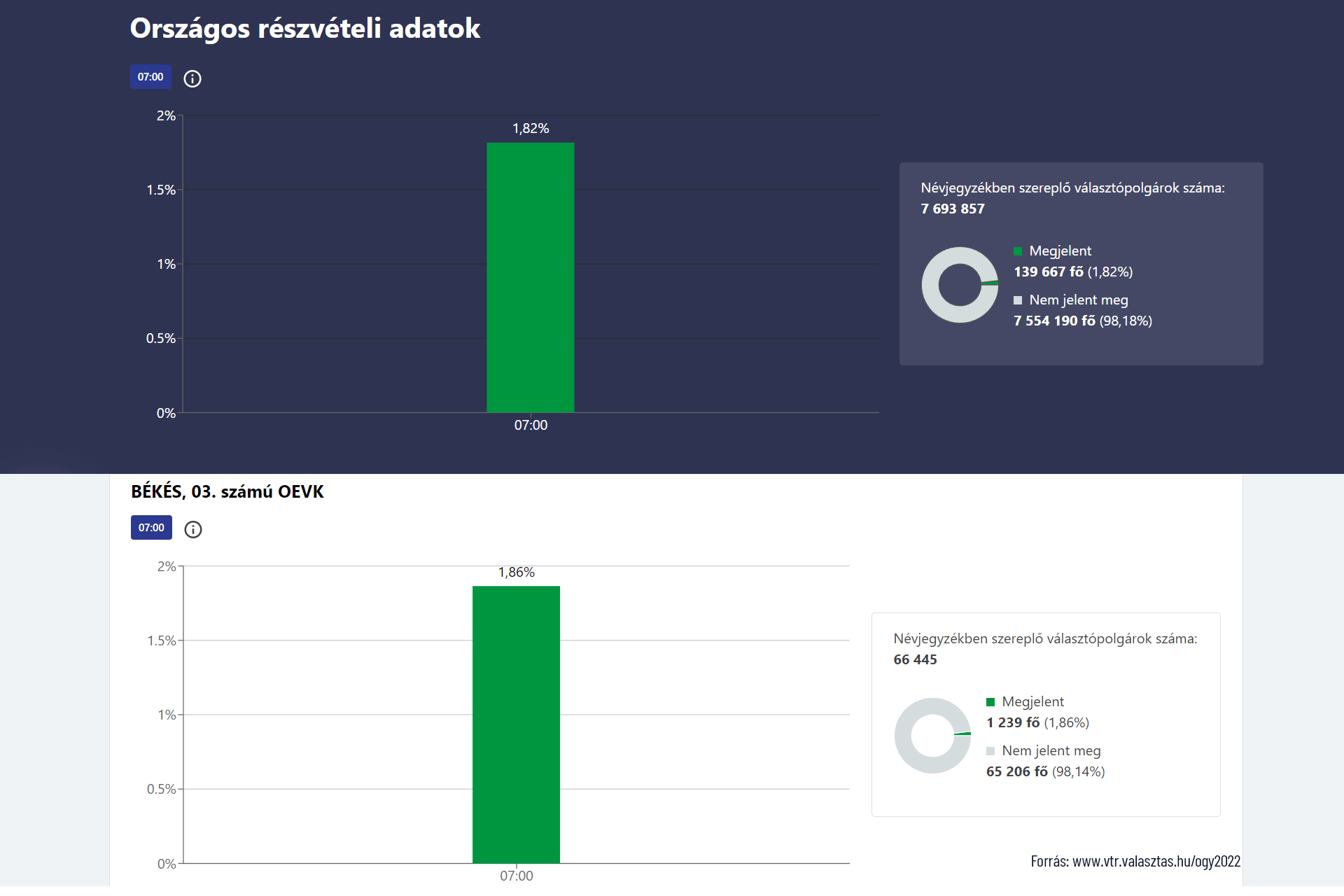 Békés megye 03. számú (gyulai központú) választókerületében 1,86%-os a részvételi arány reggel 7 óráig.