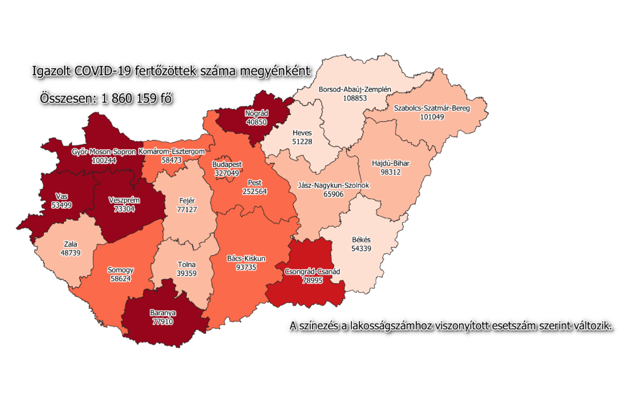 A koronavirus.gov.hu oldal térképe szerint eddig Budapesten (327 049) és Pest megyében (252 564) regisztrálták a legtöbb fertőzöttet. Ezt követi Borsod-Abaúj-Zemplén (108 853), Szabolcs-Szatmár-Bereg (101 049), Győr-Moson-Sopron (100 244), Hajdú-Bihar (98 312) és Bács-Kiskun megye (93 735). A fertőzéssel legkevésbé érintett megye továbbra is Tolna (39 359).