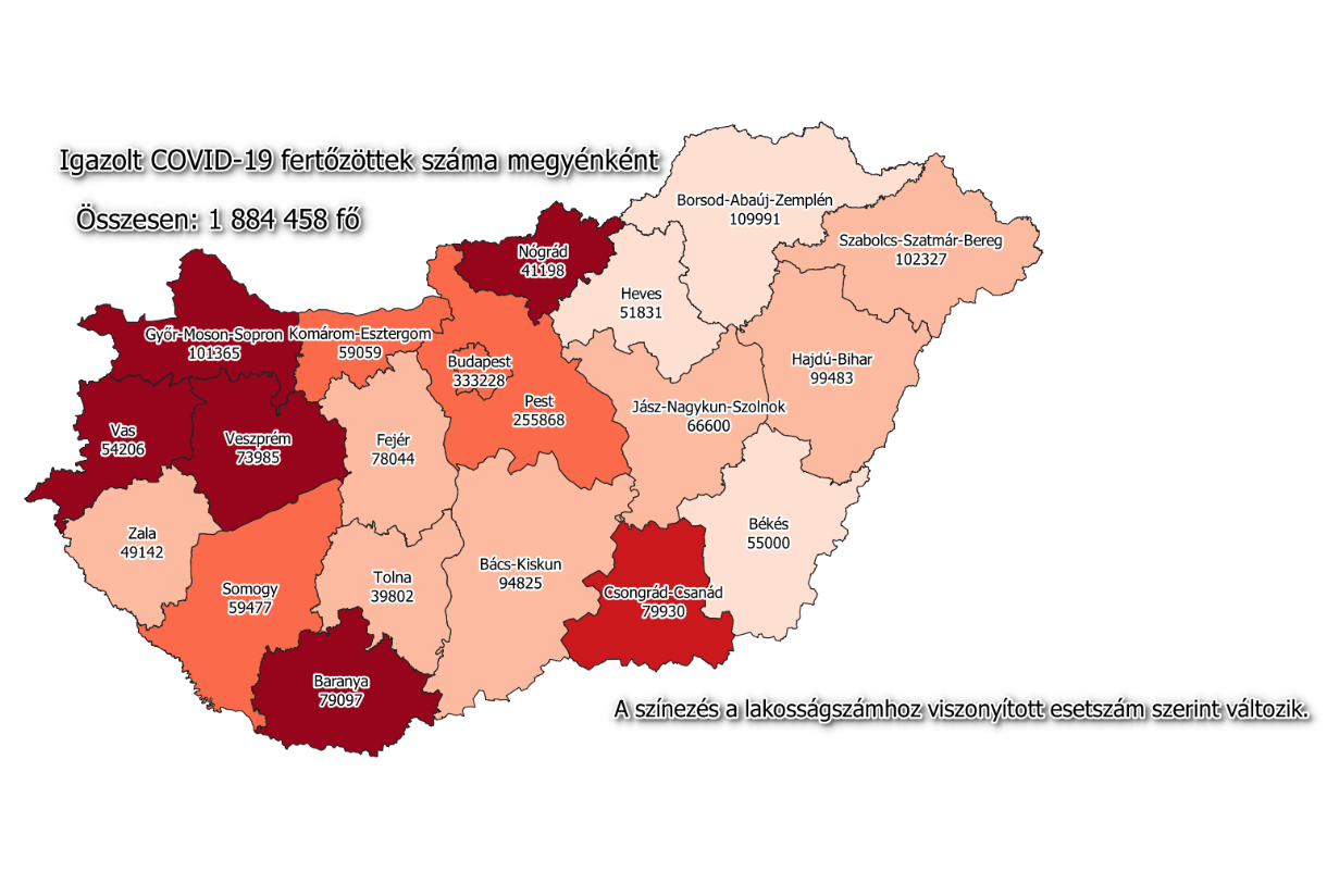 A koronavirus.gov.hu oldal térképe szerint eddig Budapesten (333 228) és Pest megyében (255 868) regisztrálták a legtöbb fertőzöttet. Ezt követi Borsod-Abaúj-Zemplén (109 991), Szabolcs-Szatmár-Bereg (102 327), Győr-Moson-Sopron (101 365), Hajdú-Bihar (99 483) és Bács-Kiskun megye (94 825). A fertőzéssel legkevésbé érintett megye továbbra is Tolna (39 802).