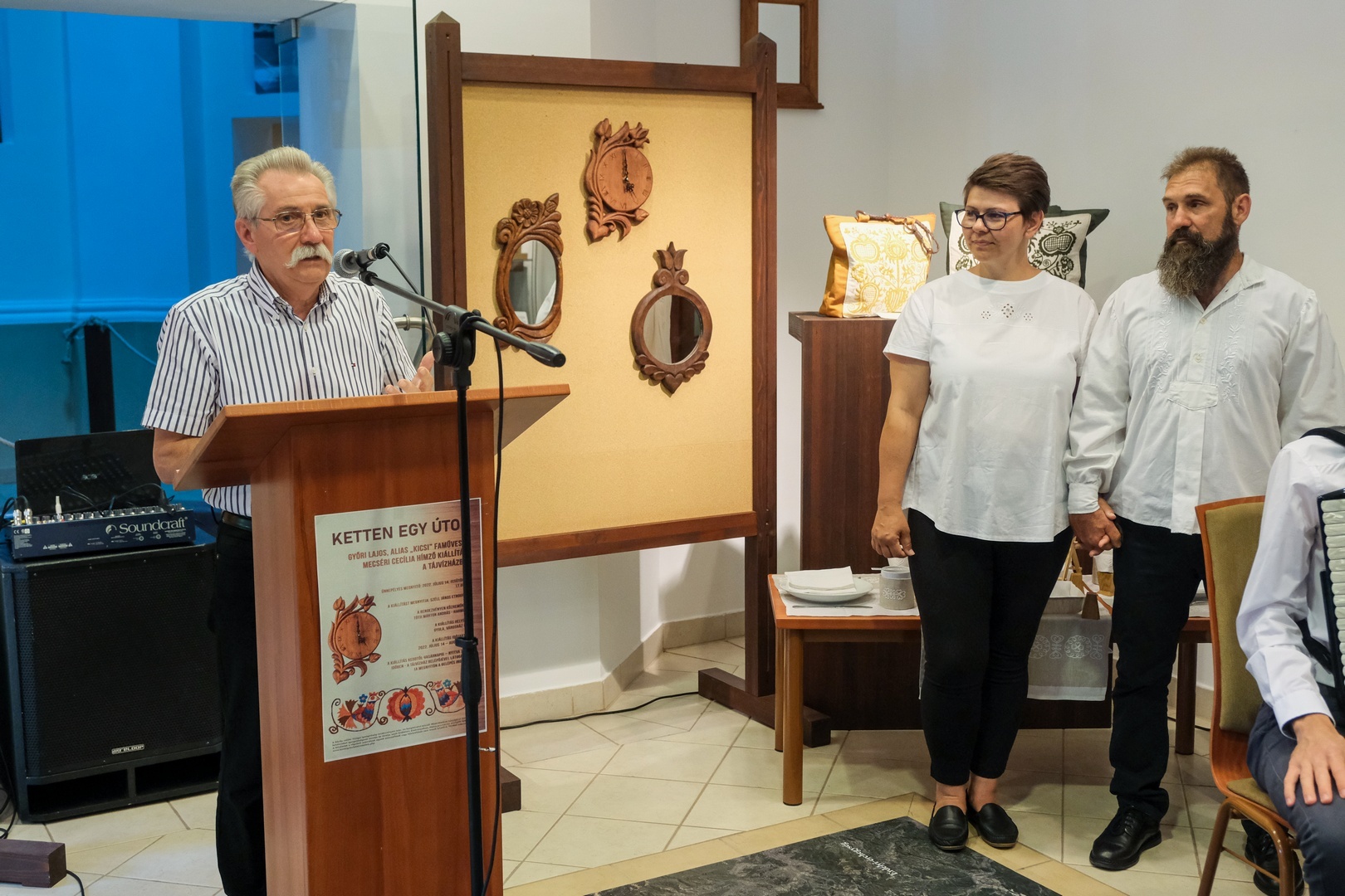 Győri Lajos „Kicsi” faműves és Mecséri Cecília hímző kiállítását nyitották meg július 14-én a Tájvízházban. Széll János etnográfus a tárlat megnyitóján úgy fogalmazott: a kiállítás két témáját adó fa és textil elválaszthatatlanok egymástól.