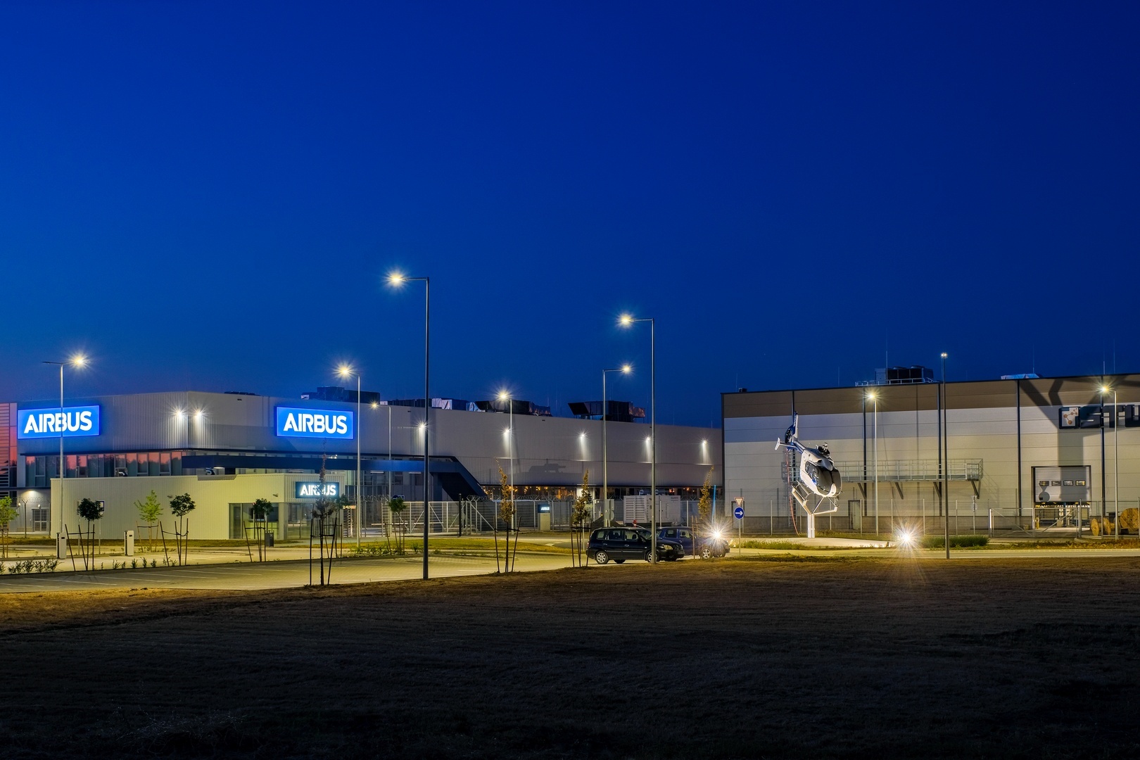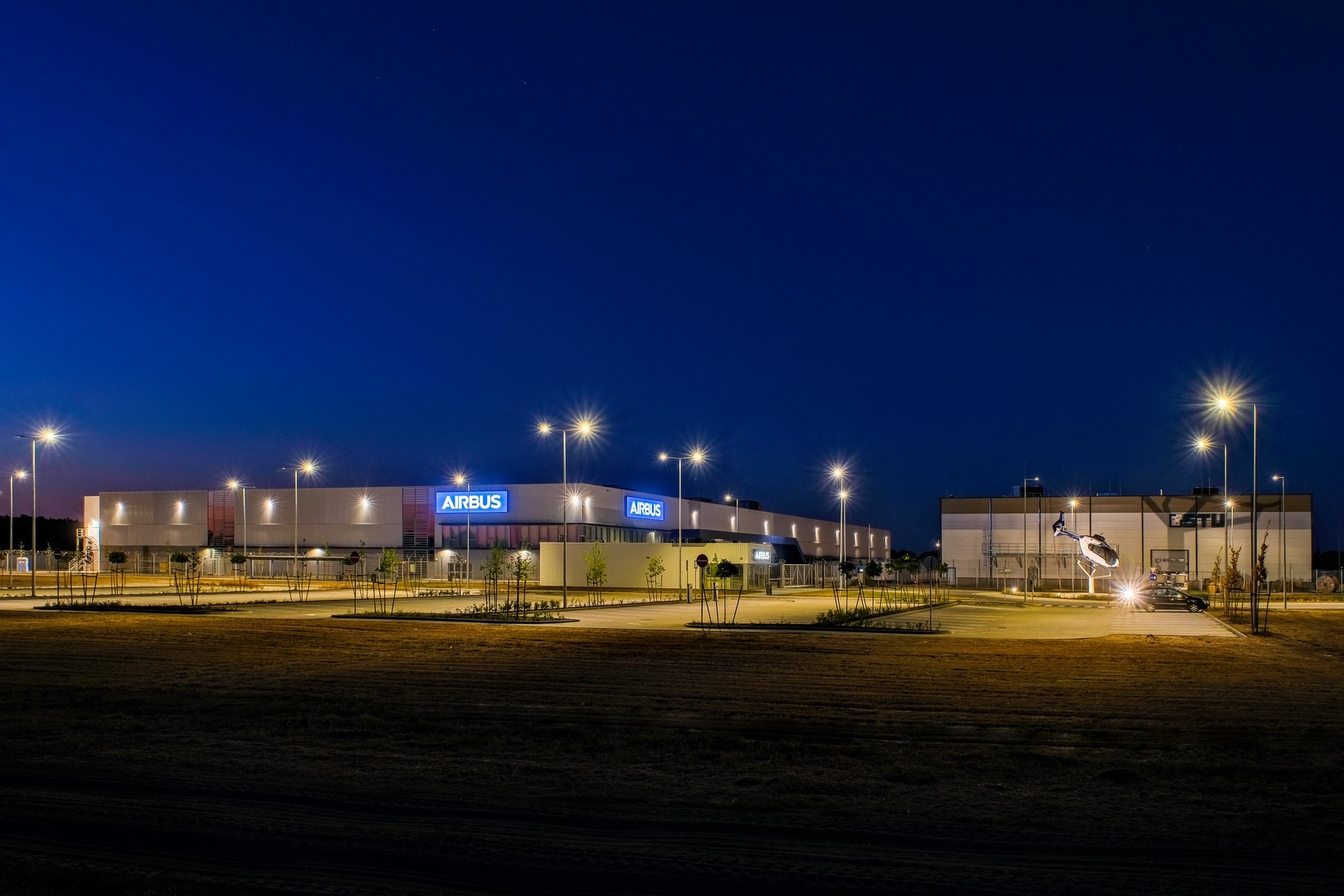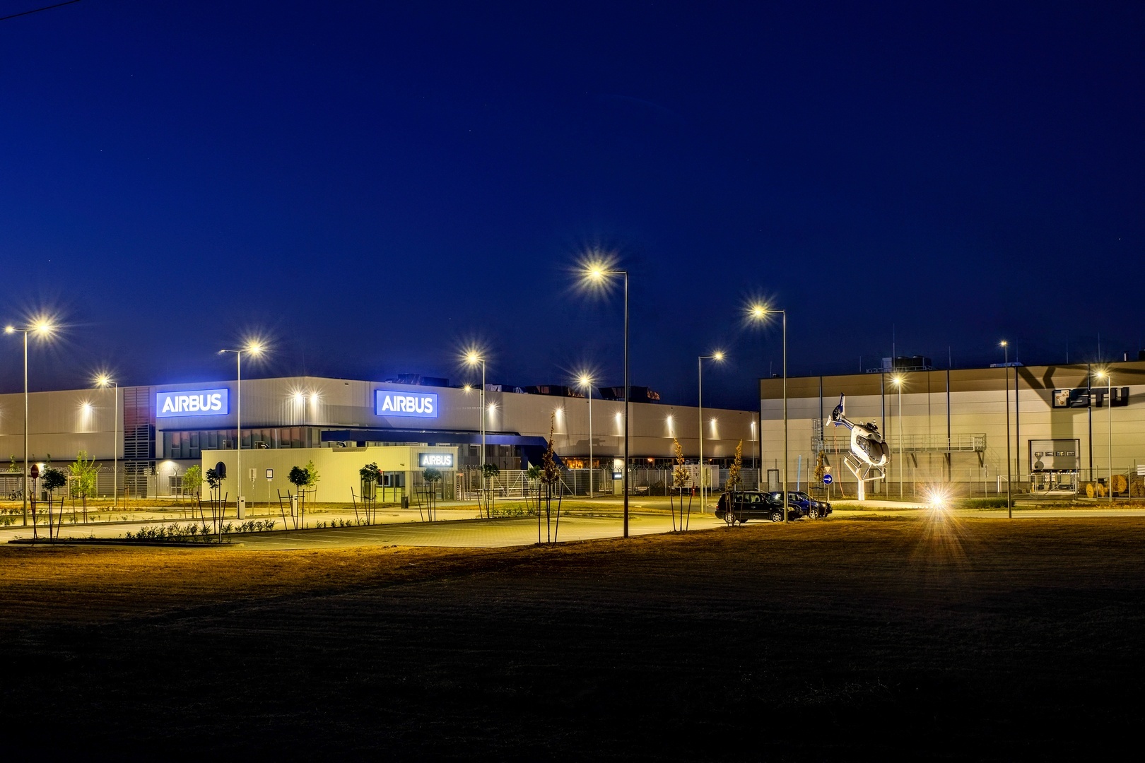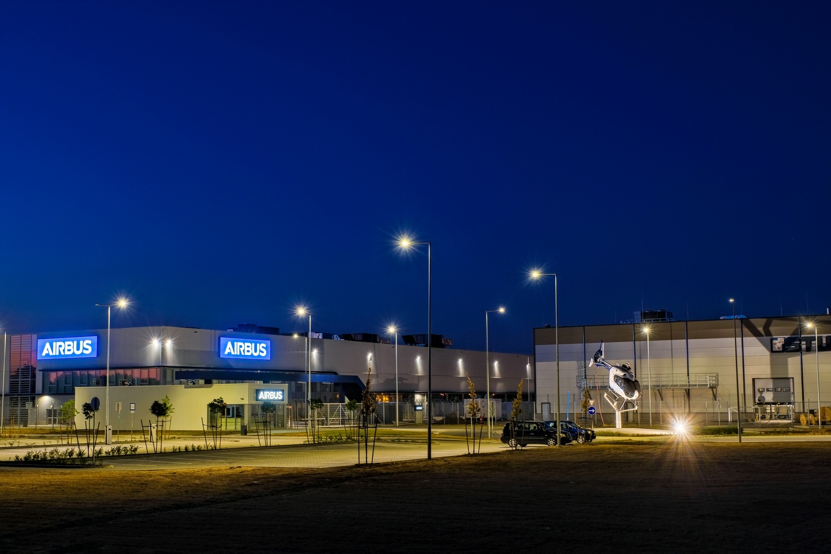 A gyulai Airbus-gyár ünnepélyes átadója július 28-án, csütörtökön délelőtt lesz. A tegnap este készült felvételeken már látható a gyár területén lévő körforgalom közepére telepített Airbus helikopter is.