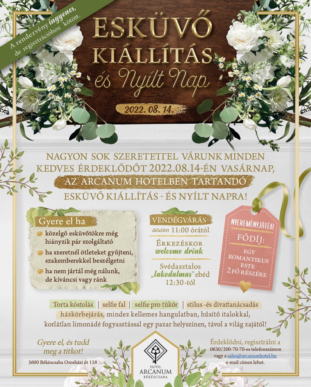 Ingyenesen látogatható esküvőkiállítást és nyílt napot tartanak augusztus 14-én, vasárnap 11 órától a békéscsabai Arcanum Hotelben (Orosházi út 158.).