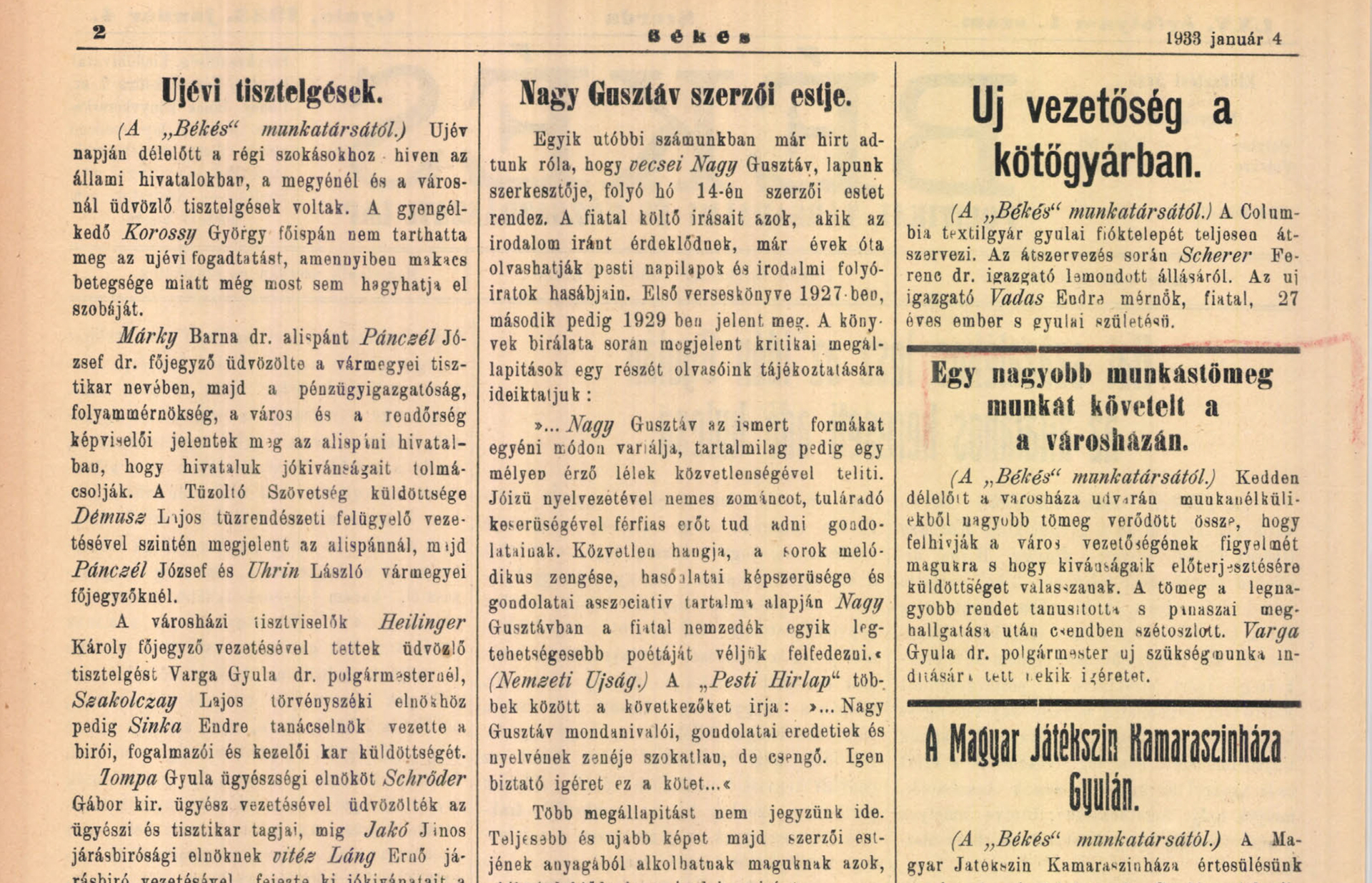 120 évvel ezelőtt, 1902. augusztus 18-án született Karcagon Nagy Gusztáv (meghalt 1969-ben) költő, író, újságíró, földhivatali tisztviselő, levéltáros. A Pesti Napló közölte első verseit. 1925-től betegsége gyógyítása miatt Békés megyébe jött. Több Békés megyei lap külső munkatársa volt, 1932–1936 között a Békés című lap főszerkesztője, 1937-től a Sarkadi Hírek felelős szerkesztője volt. 1940-ben a lappal együtt Nagyváradra települt át. 1944-ben Budapestre távozott. Újra megbetegedett, előbb Orosházára, majd Gyulára jött gyógyíttatni magát. 1946–1951 között a Békés Megyei Földhivatal előadója volt, munkája mellett néprajzi gyűjtést végzett. 1951–1957 között a Békés Megyei Levéltár munkatársa volt. Nyugdíjazása után néprajzi tanulmányai jelentek meg a szaklapokban.