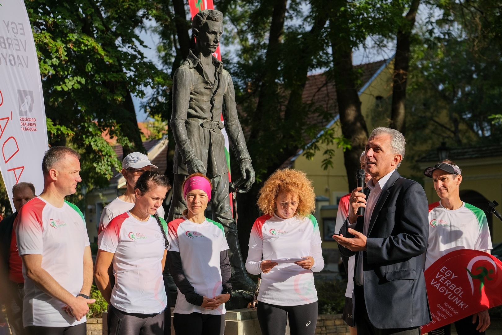 A megjelenteket Gui Angéla, az Egy Vérből Vagyunk Alapítvány alapítója, az esemény ötletgazdája köszöntötte. Mint mondta, a futók kedden reggel rajtoltak el Kiskőrösről, a cél pedig a Máramaros megyében található Koltó.
