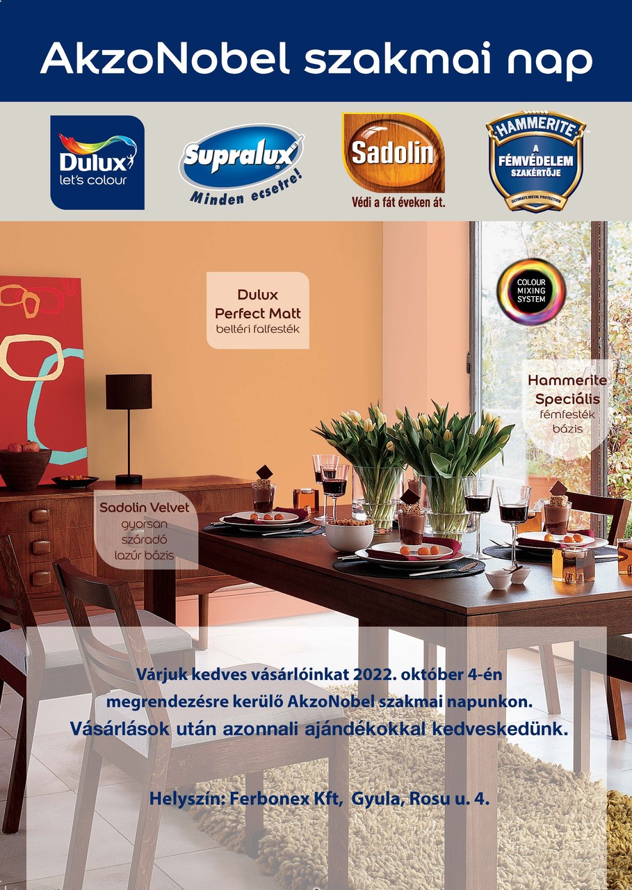 A gyulai Ferbonex üzletház október 4-én szakmai napot tart az AkzoNobel vállalat jóvoltából Gyulán, a Rosu utca 4. szám alatti telephelyén. A betérőknek ajándékokkal kedveskednek.