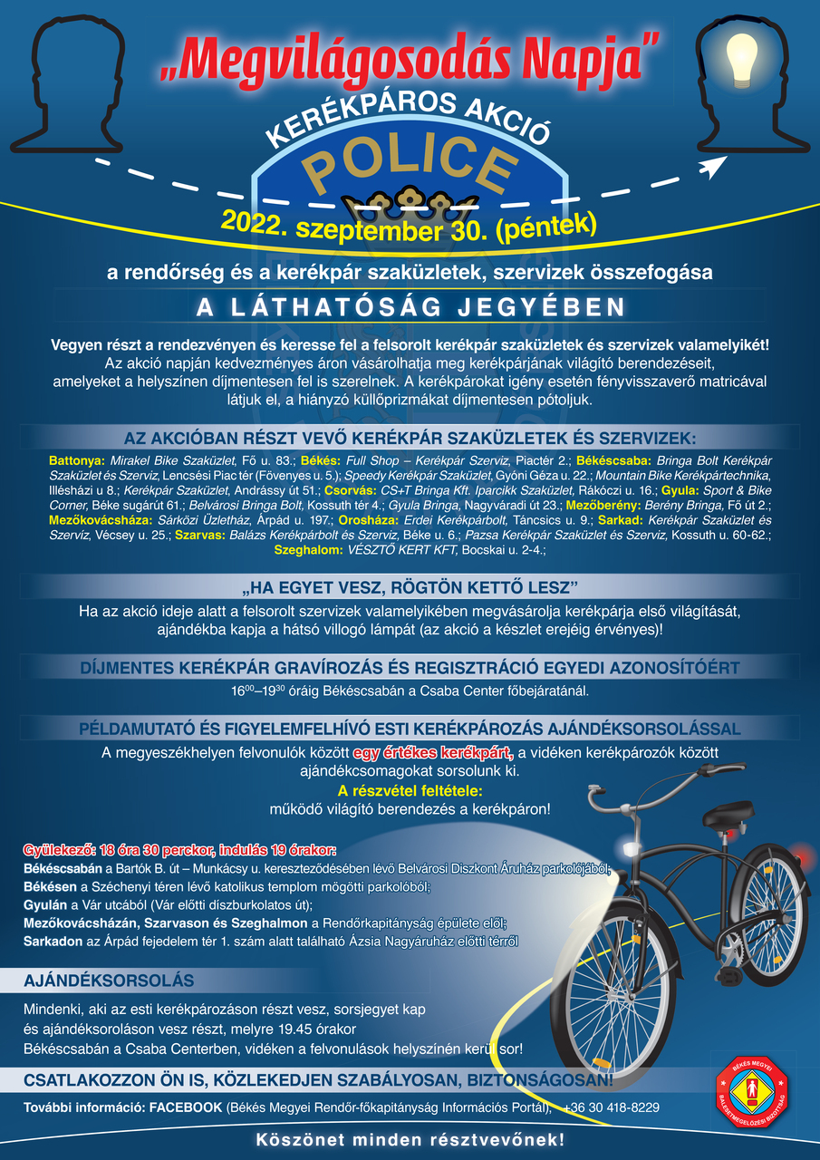 Békés megyében két év kihagyás után, 17. alkalommal tartja meg a rendőrség a „Megvilágosodás Napját”, melynek célja, hogy felhívja a kerékpárral közlekedők figyelmét a láthatóság fontosságára. Az akció keretében 9 óra és 18 óra között a megye 11 településén 17 kerékpárüzlet, illetve szerviz várja kedvezményekkel a bicikliseket. A rendezvényen 2019-ben csaknem kétezren vettek részt.