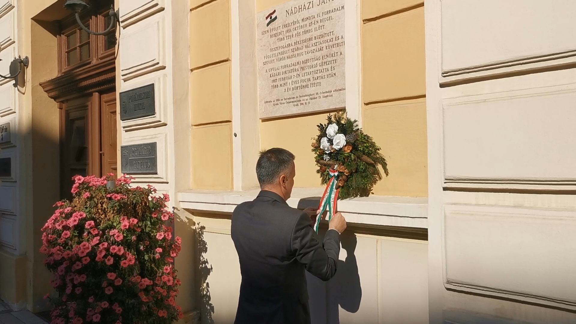 A gyulai forradalmi bizottság egykori elnökének, Nádházi Jánosnak az emléktábláját koszorúzták meg csütörtökön a városháza bejáratánál. A tábla, melyet M. Szabó András 1956-os gyulai polgármester kezdeményezésére helyezték el a forradalom hatvanadik évfordulóján, az elnök helyszínen elmondott beszédének állít emléket.