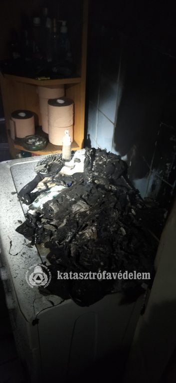 Az esethez riasztott helyi hivatásos tűzoltók átvizsgálták az épületet, majd egy vízsugár segítségével eloltották a fürdőszobában a kigyulladt mosógépet és a rá halmozott füstölgő ruhaneműket.