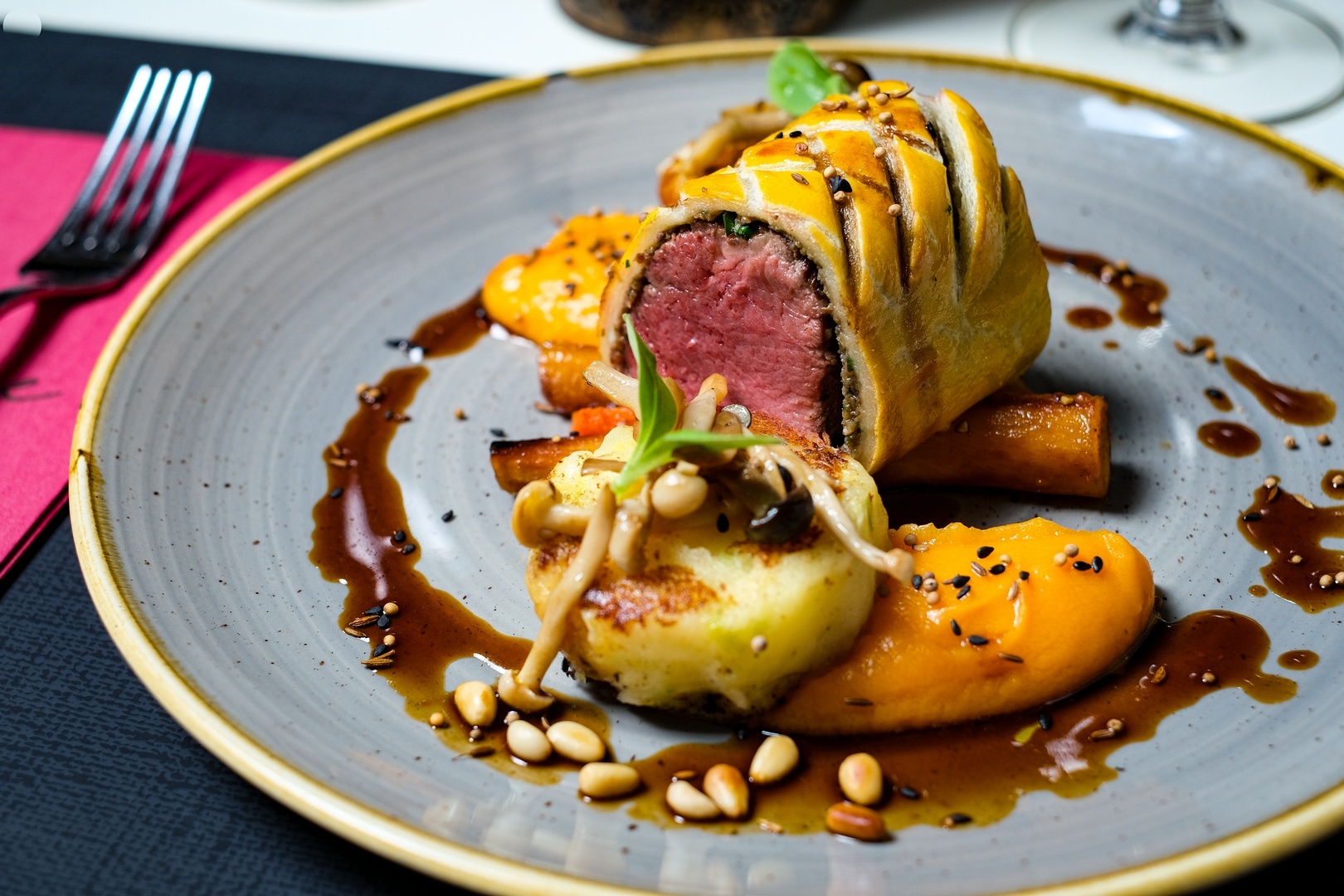 Vaddisznó Wellington-módra, dödölle, mézben sült zöldségek, édesburgonyakrém, barnamártás