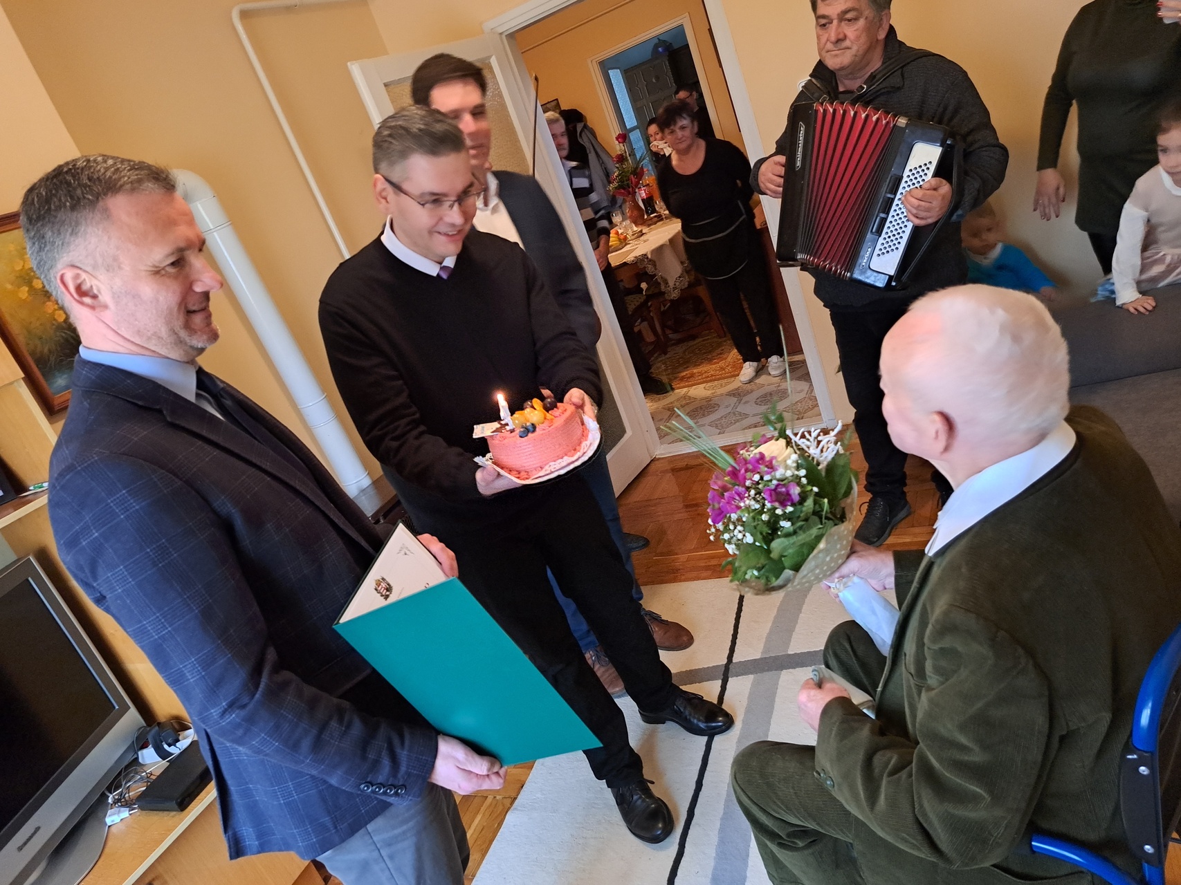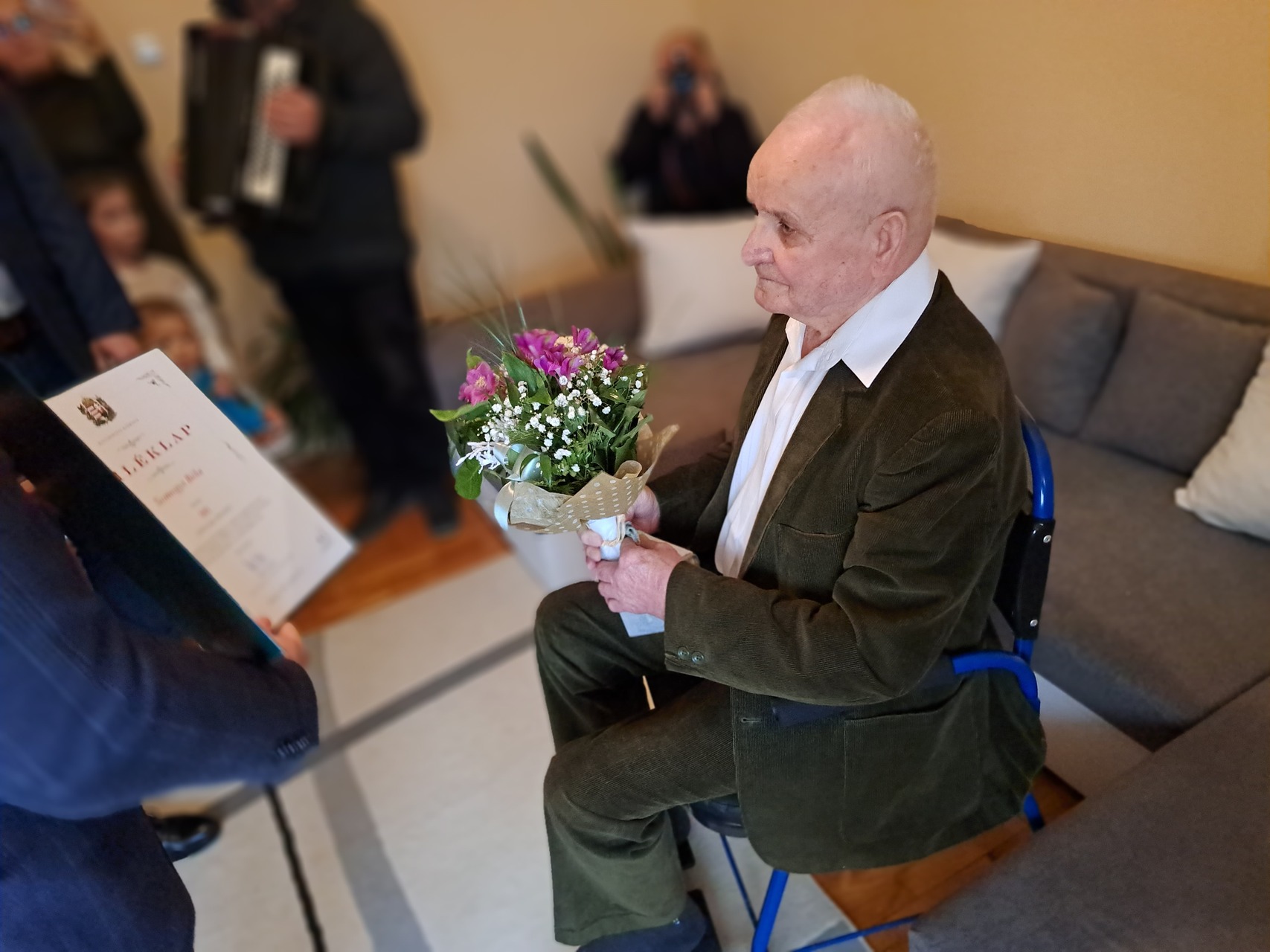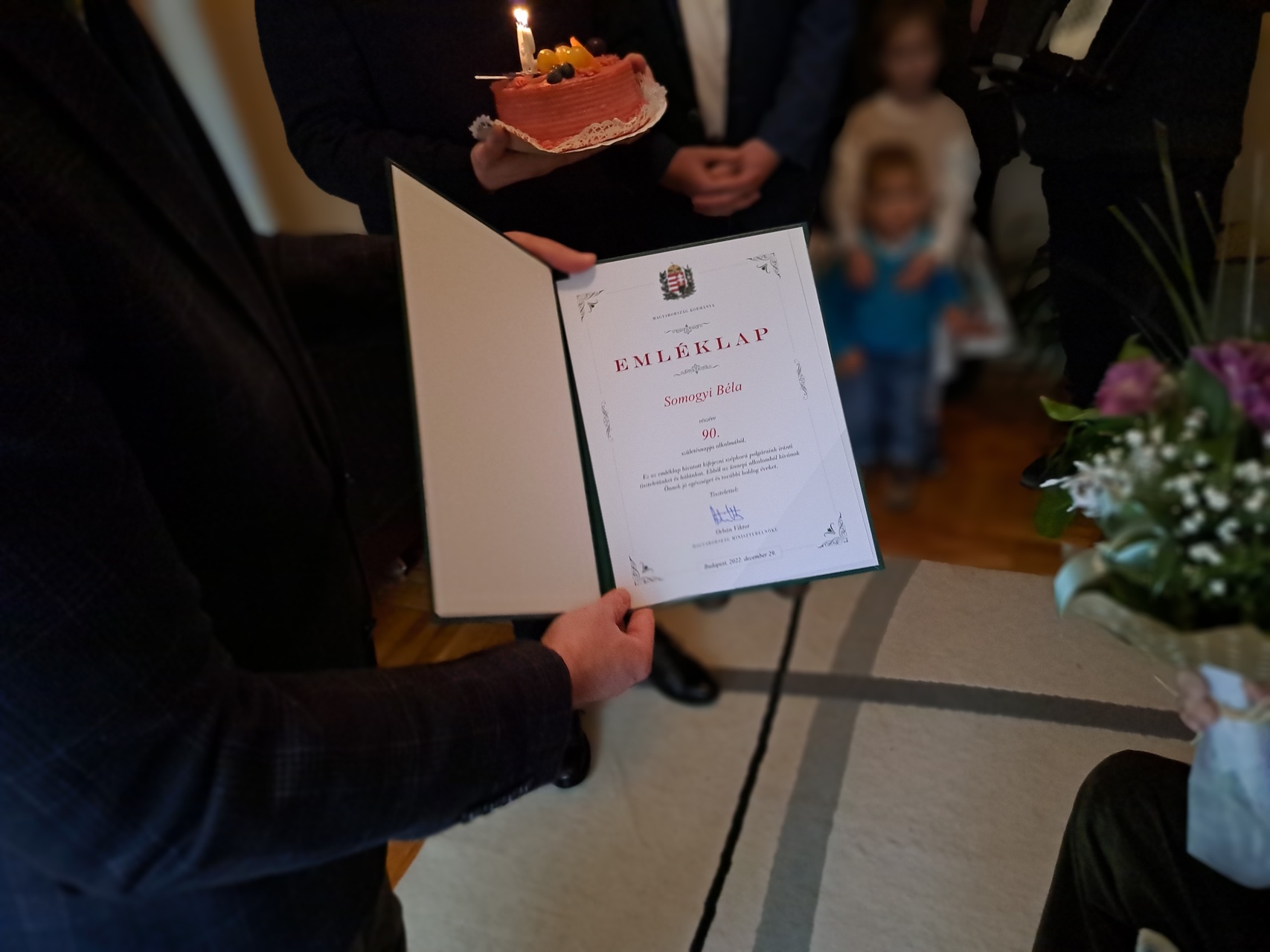 Az ünnepeltet zenés köszöntés várta, valamint tortával, virággal és a miniszterelnök által aláírt emléklappal kedveskedtek neki.