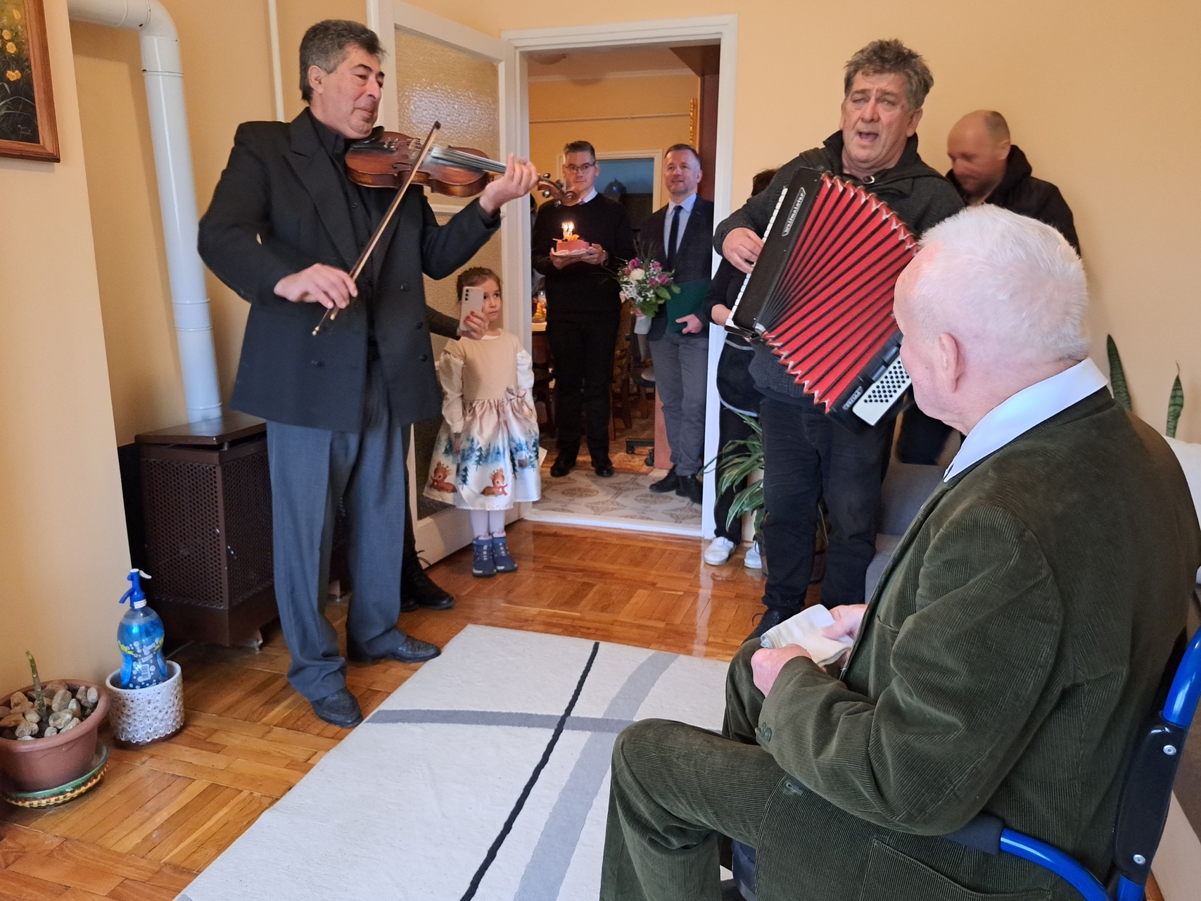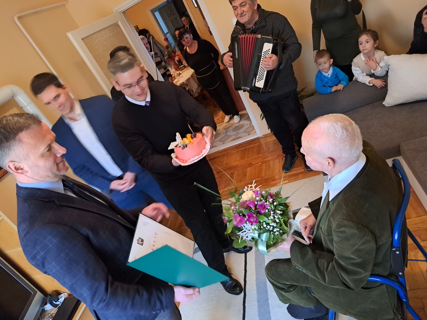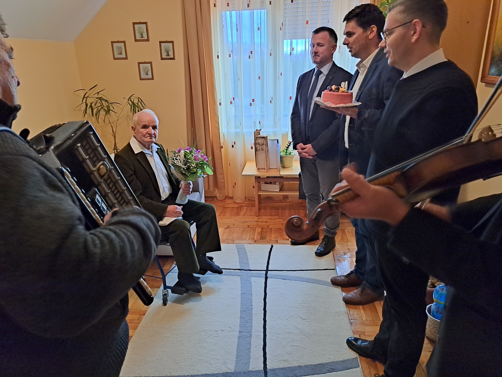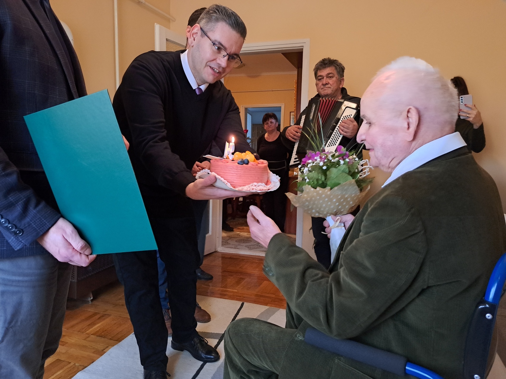 Az ünnepeltet zenés köszöntés várta, valamint tortával, virággal és a miniszterelnök által aláírt emléklappal kedveskedtek neki.