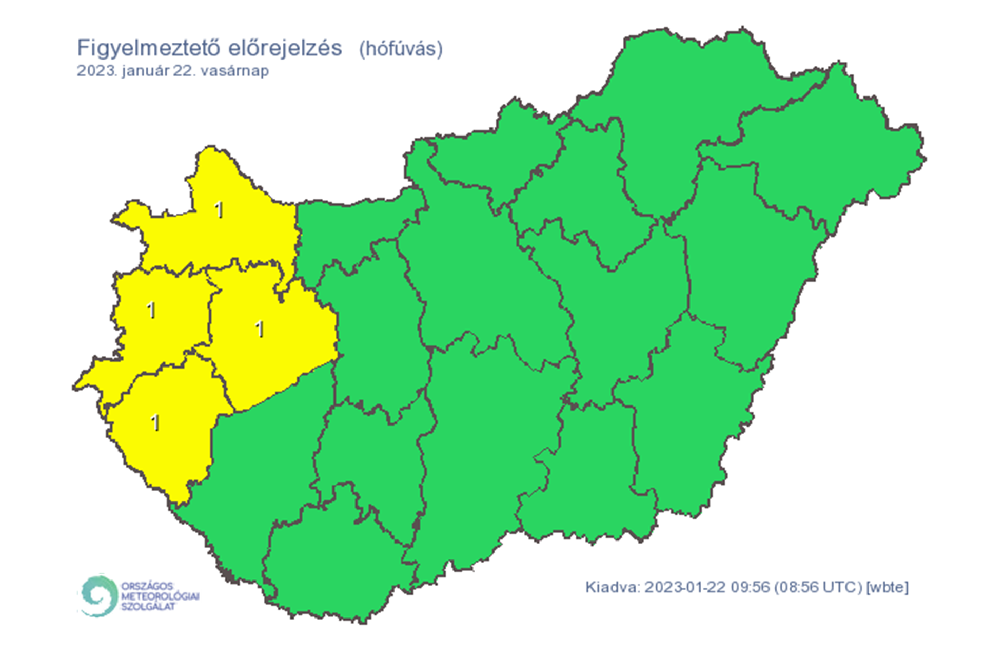 A Dunántúl nyugati felén tovább folytatódik a havazás változó intenzitással: a Dél-Dunántúlt a déli órákig, míg az Észak-Dunántúlt késő délután hagyhatja el a csapadékzóna nyugat felé. A csapadékzóna távozásáig területi átlagban további 2–5 cm körüli hóréteg gyarapodás várható, több hó a hegyekben valószínű. Ma napközben az Alpokalja és a Kisalföld térségében a többnyire élénk, időnként erős széllökések akár gyenge hófúvást is okozhatnak – írta a met.hu.