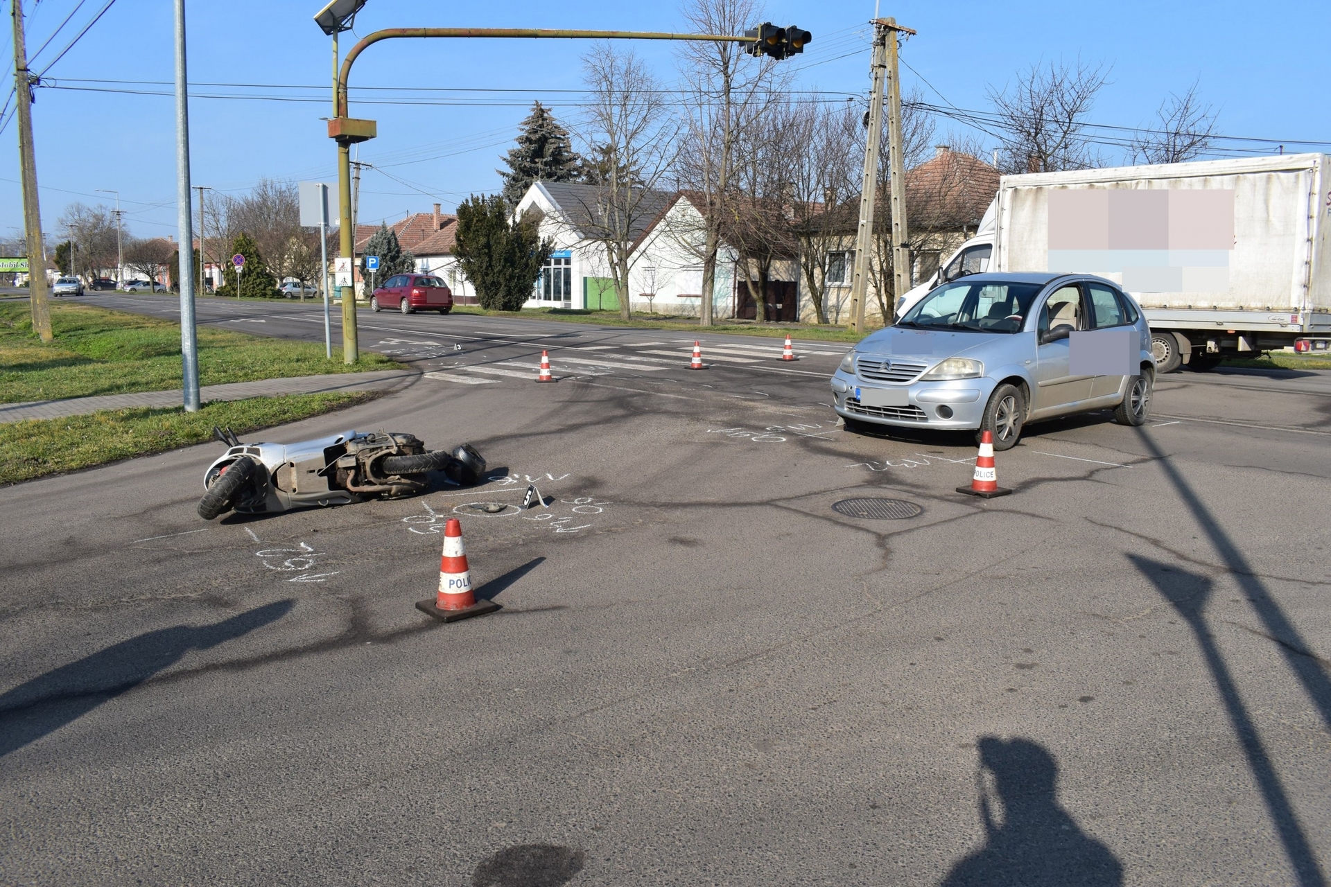 Összeütközött egy személyautó és egy segédmotor-kerékpáros március 4-én a reggeli órákban Mezőkovácsházán, a József Attila utcában – közölte a police.hu.