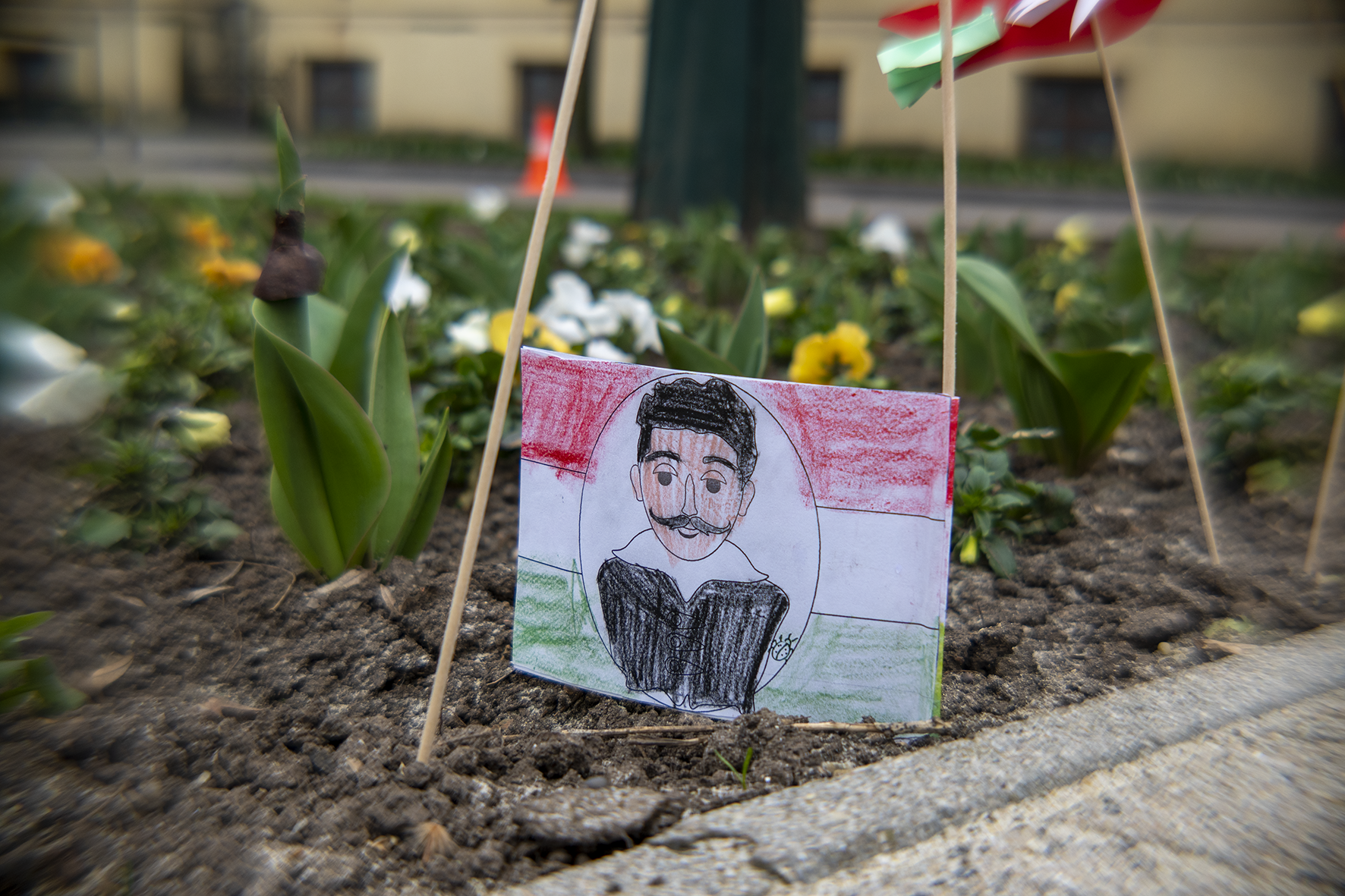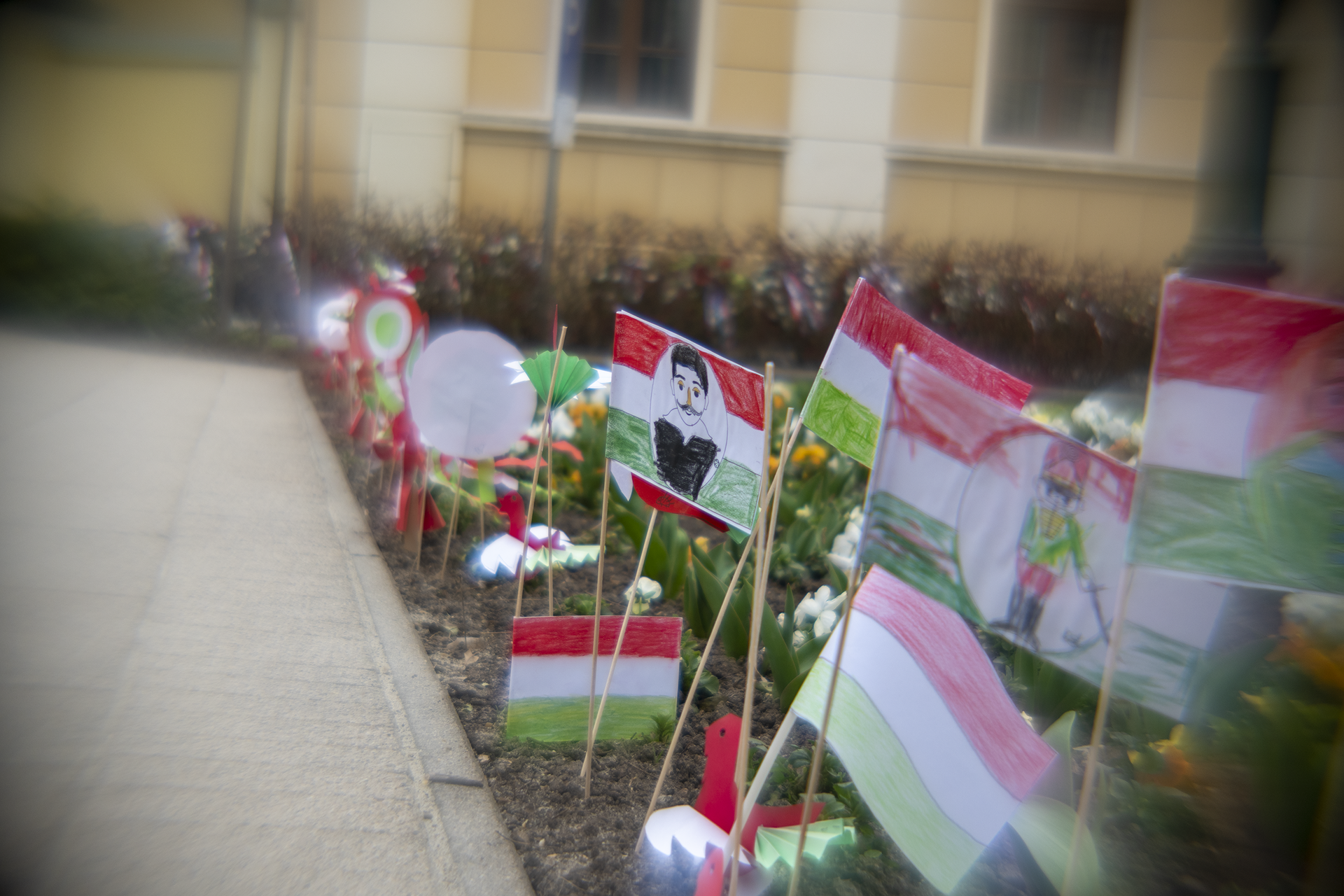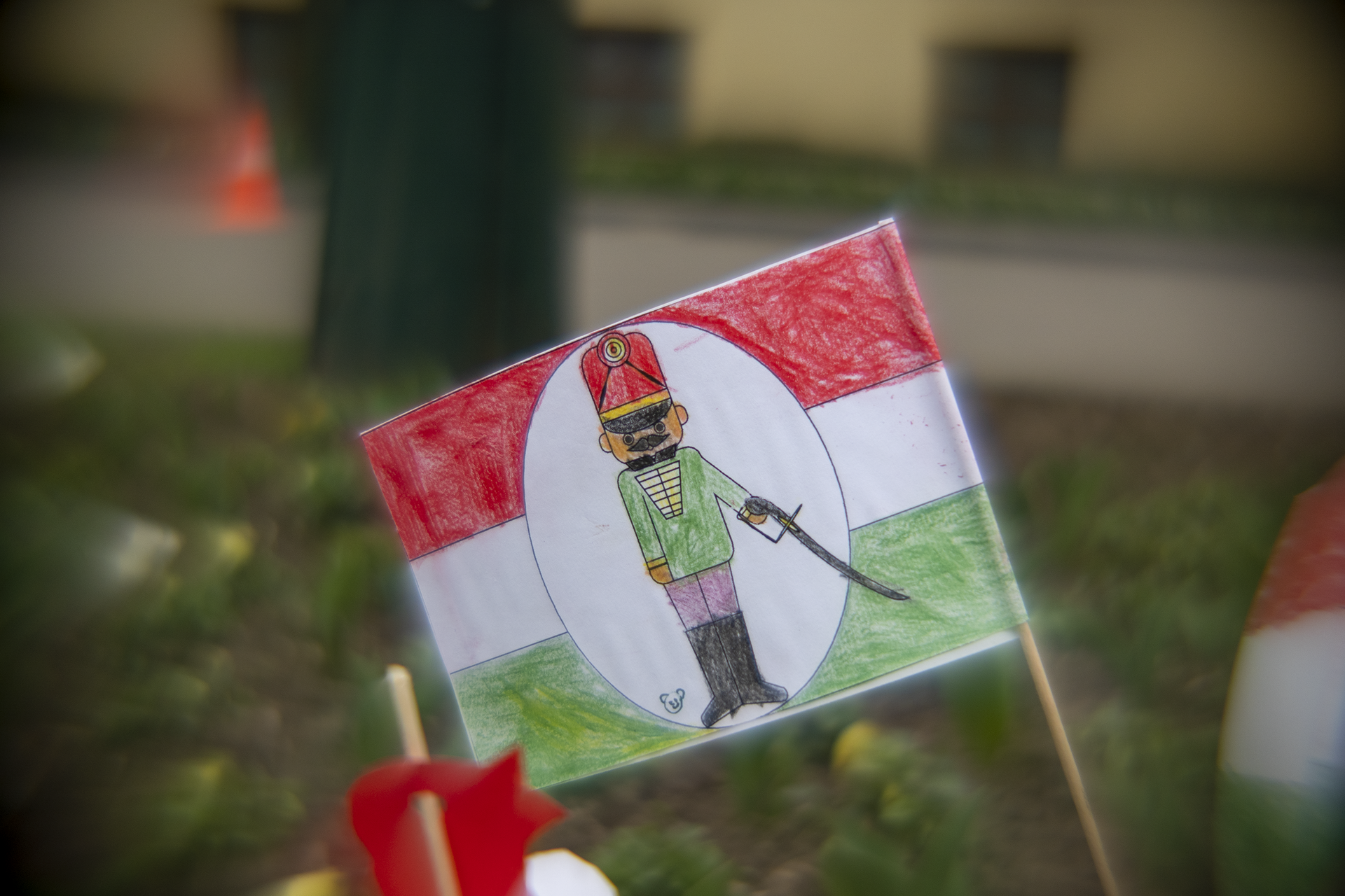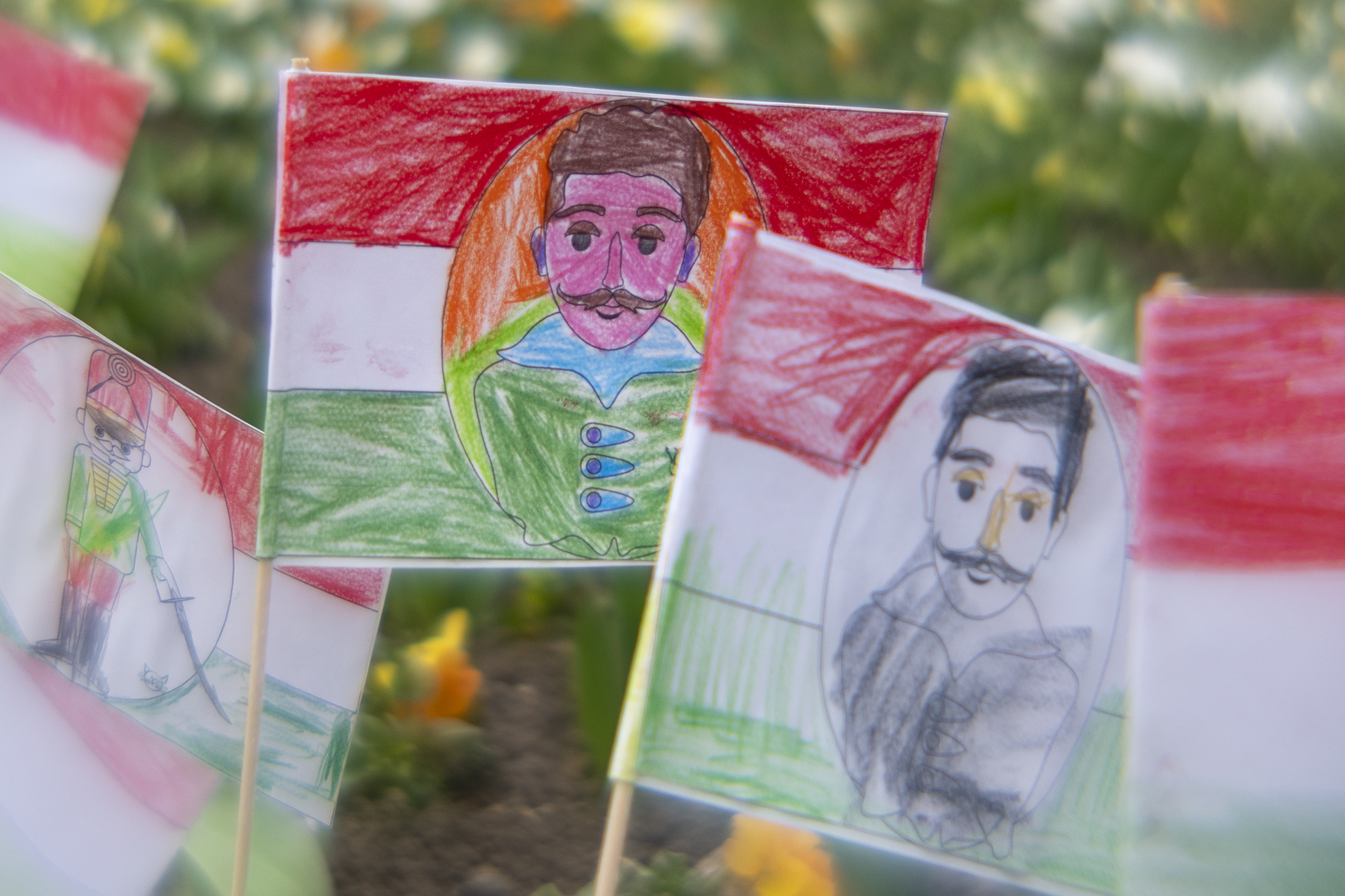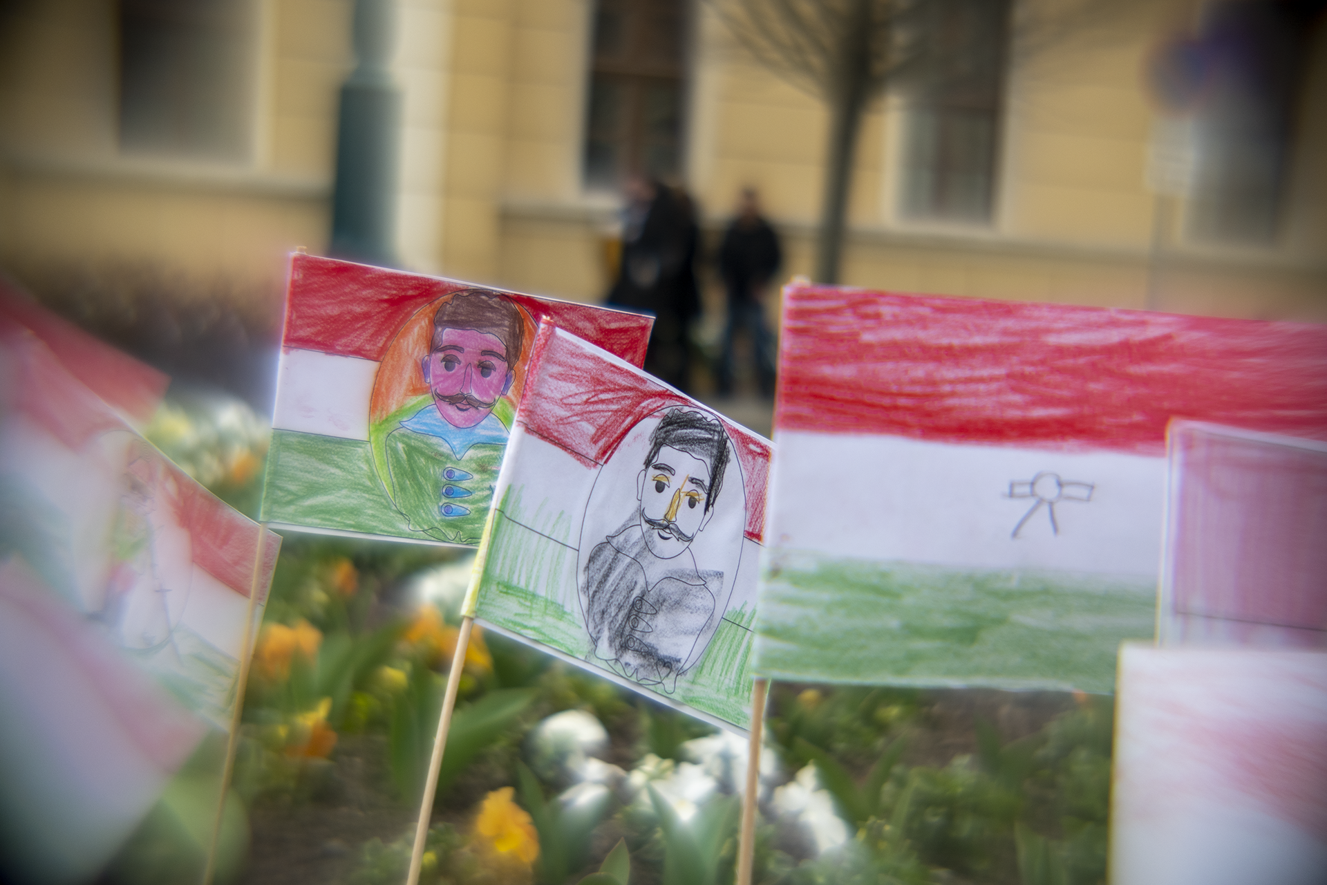 Gyerekek által készített március 15-ei zászlók a gyulai Petőfi téren