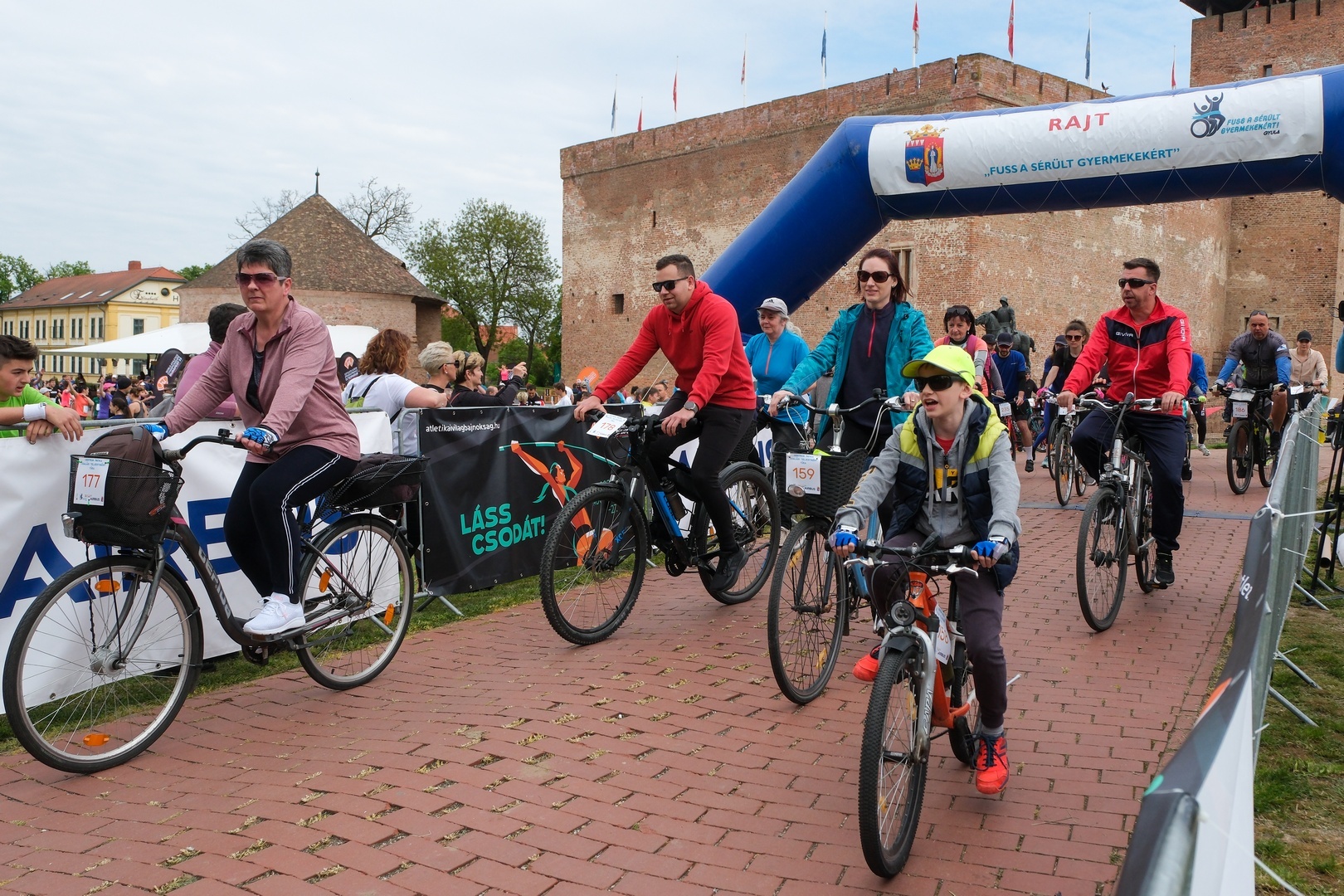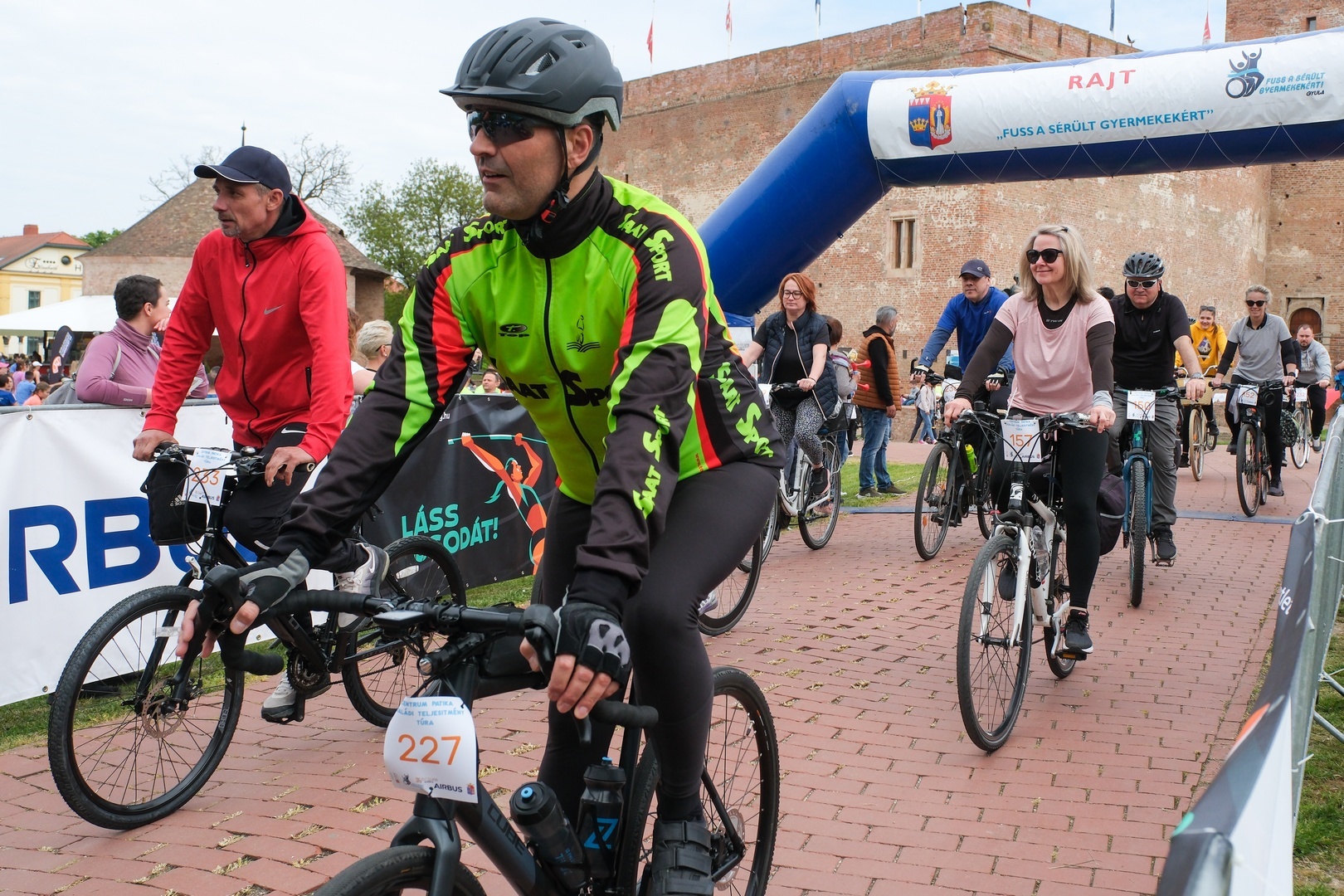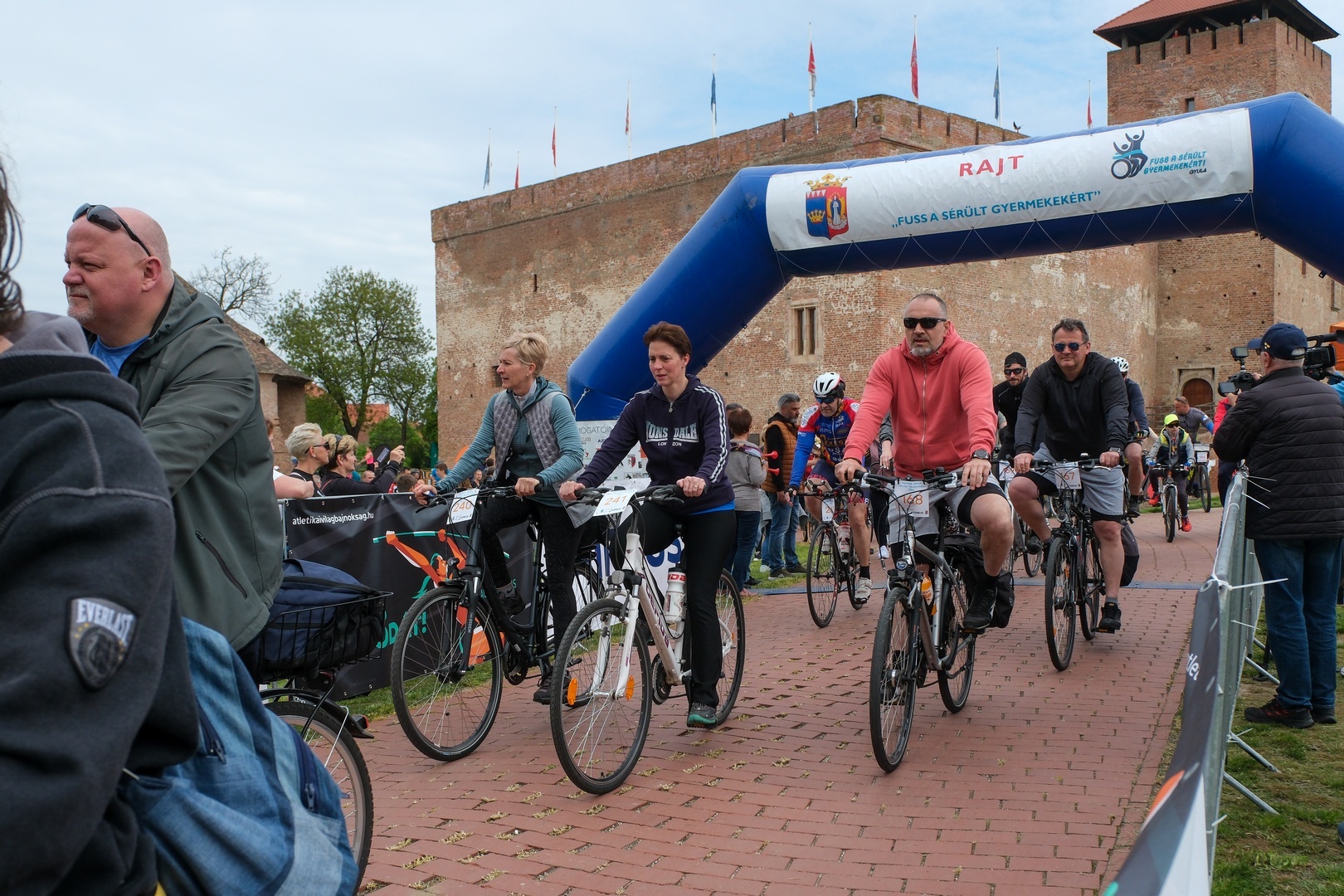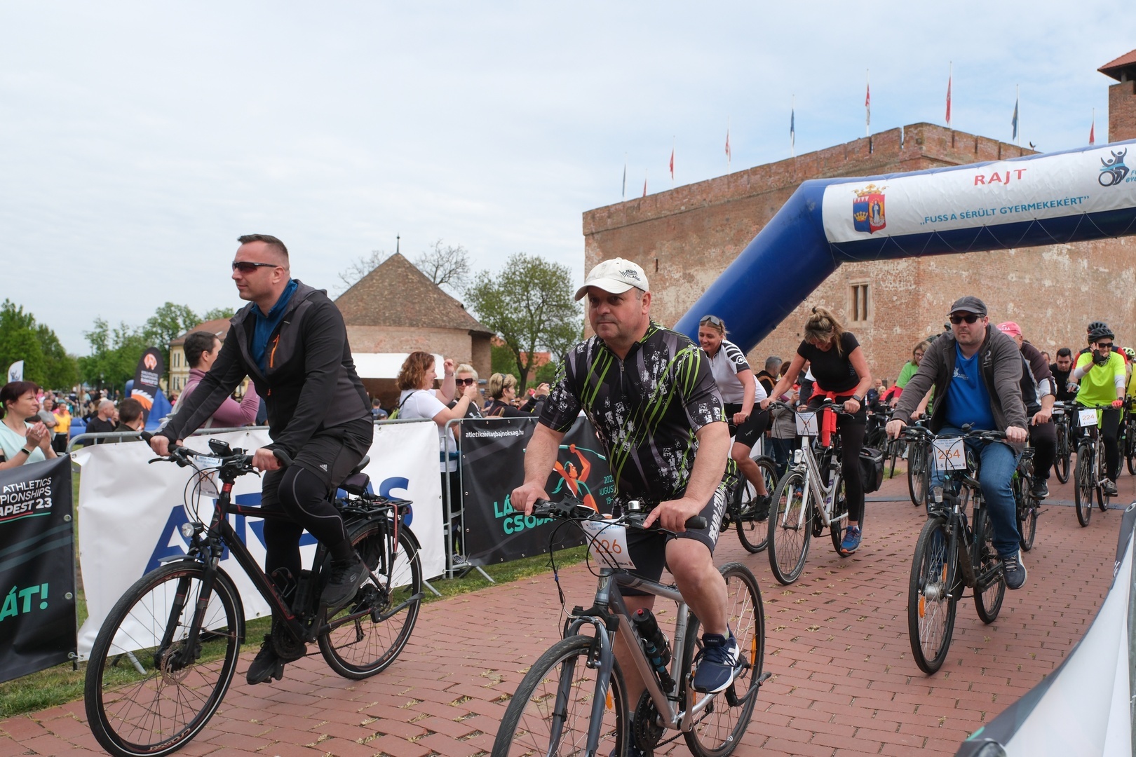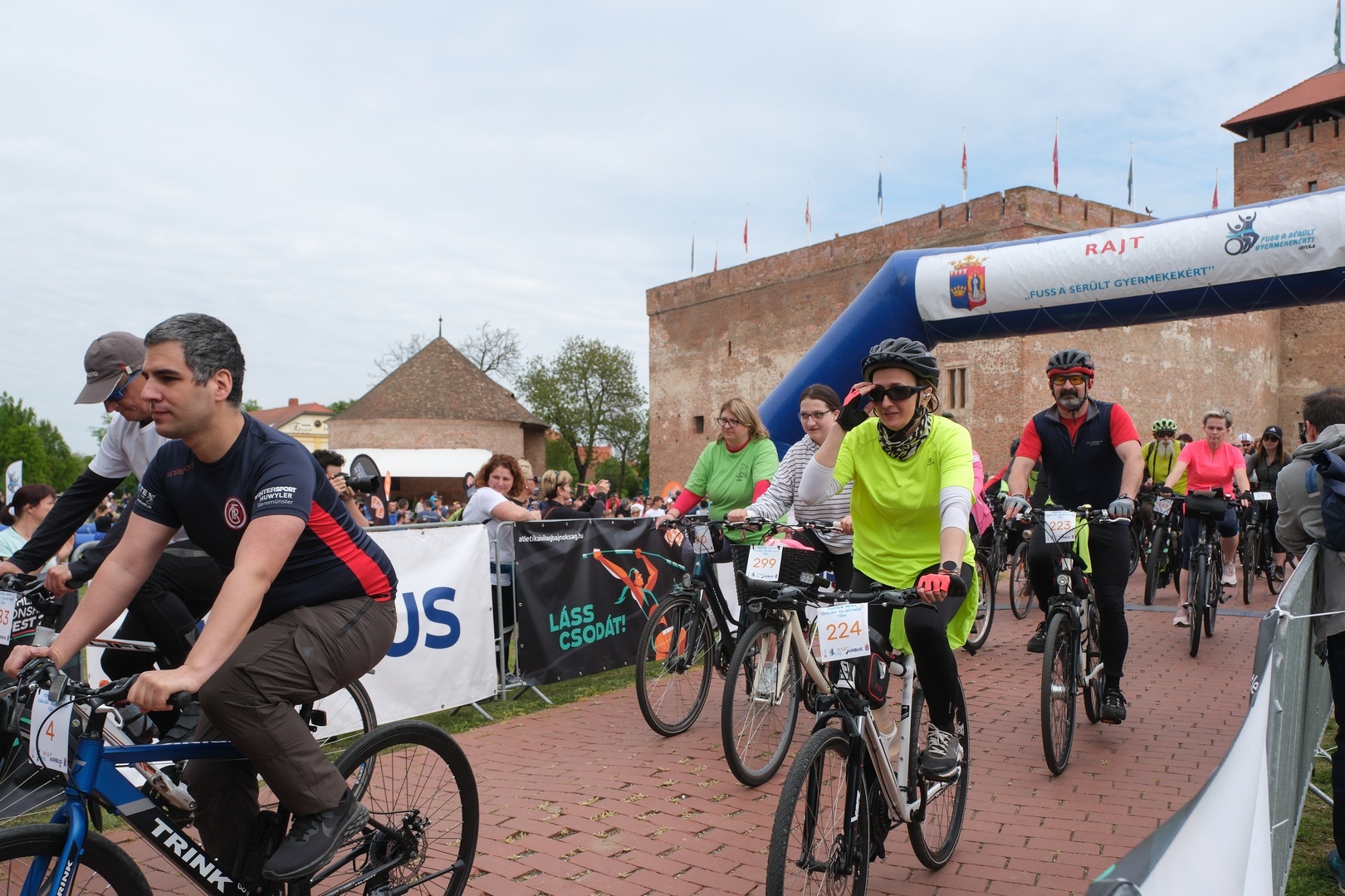 A kerékpárosok és kerekesszékesek rajtja a Fuss a sérült gyermekekért! versenyen