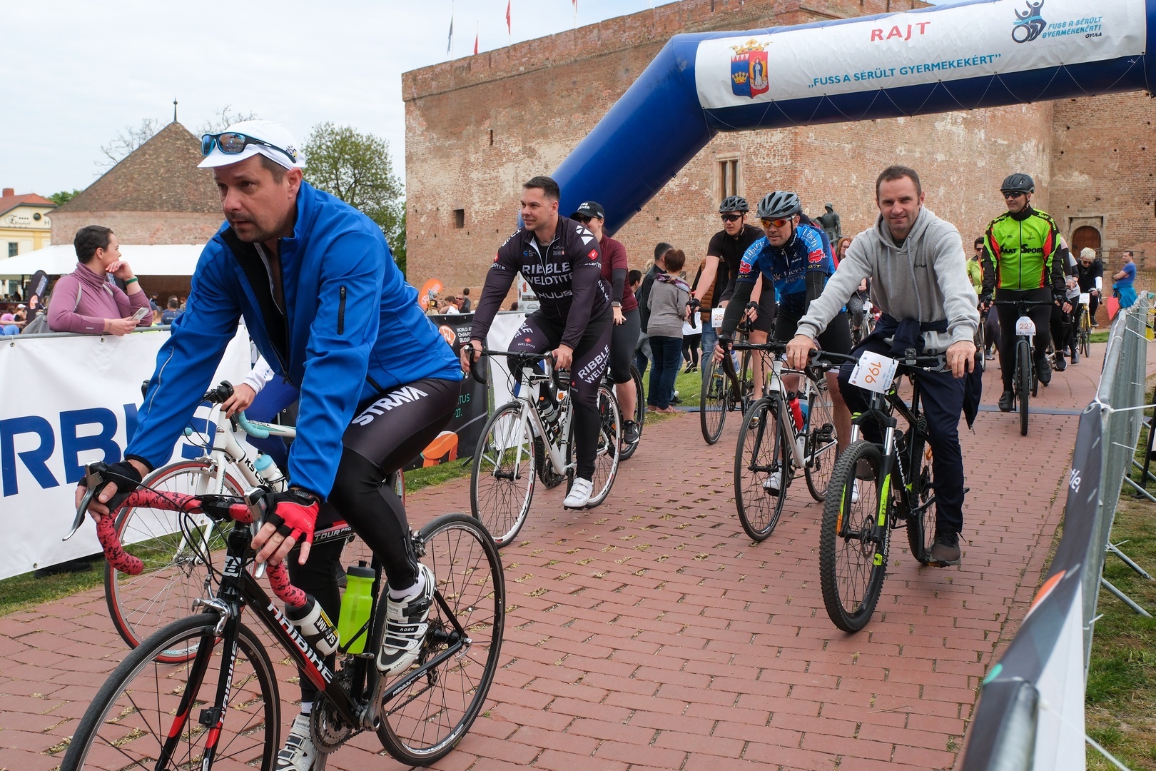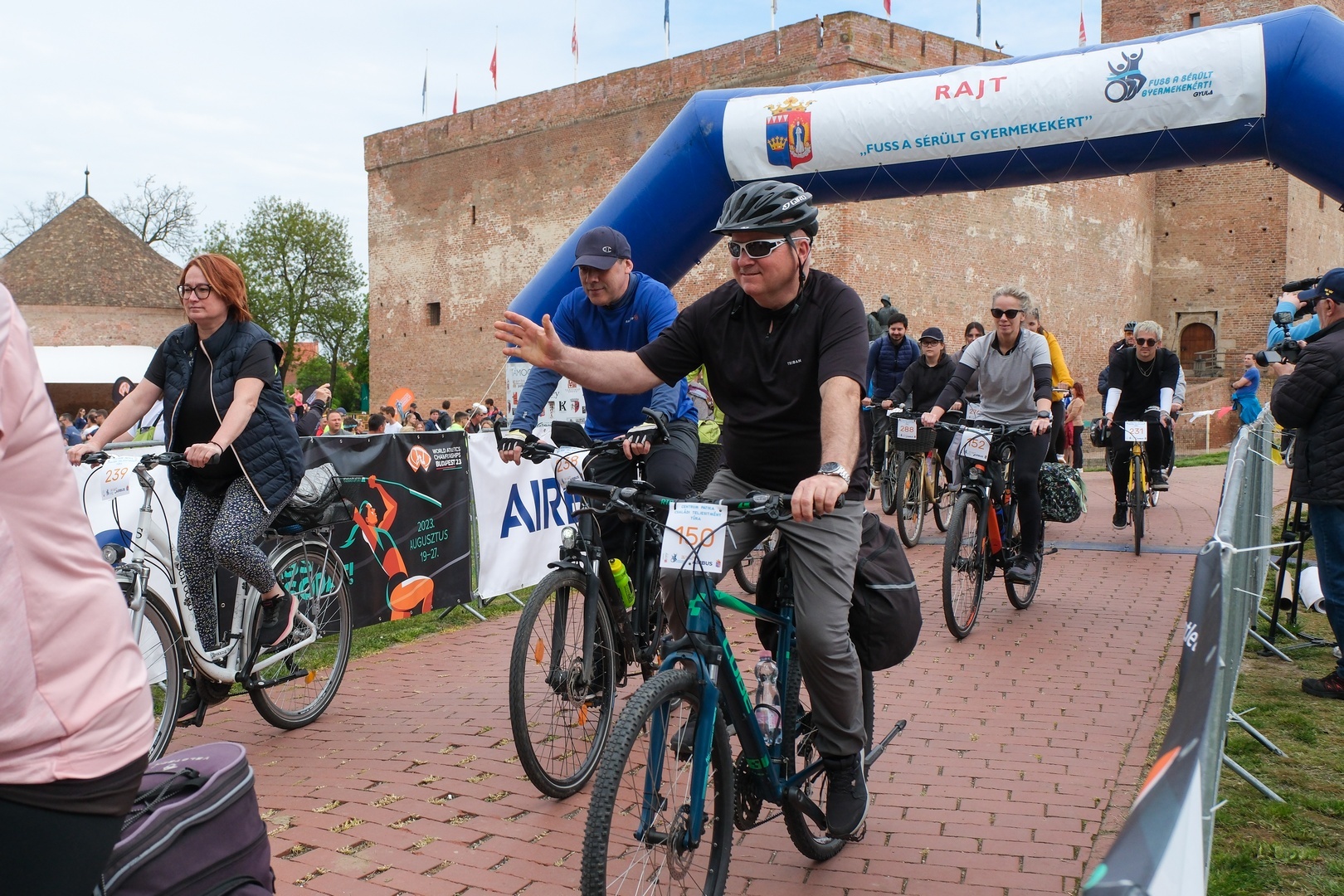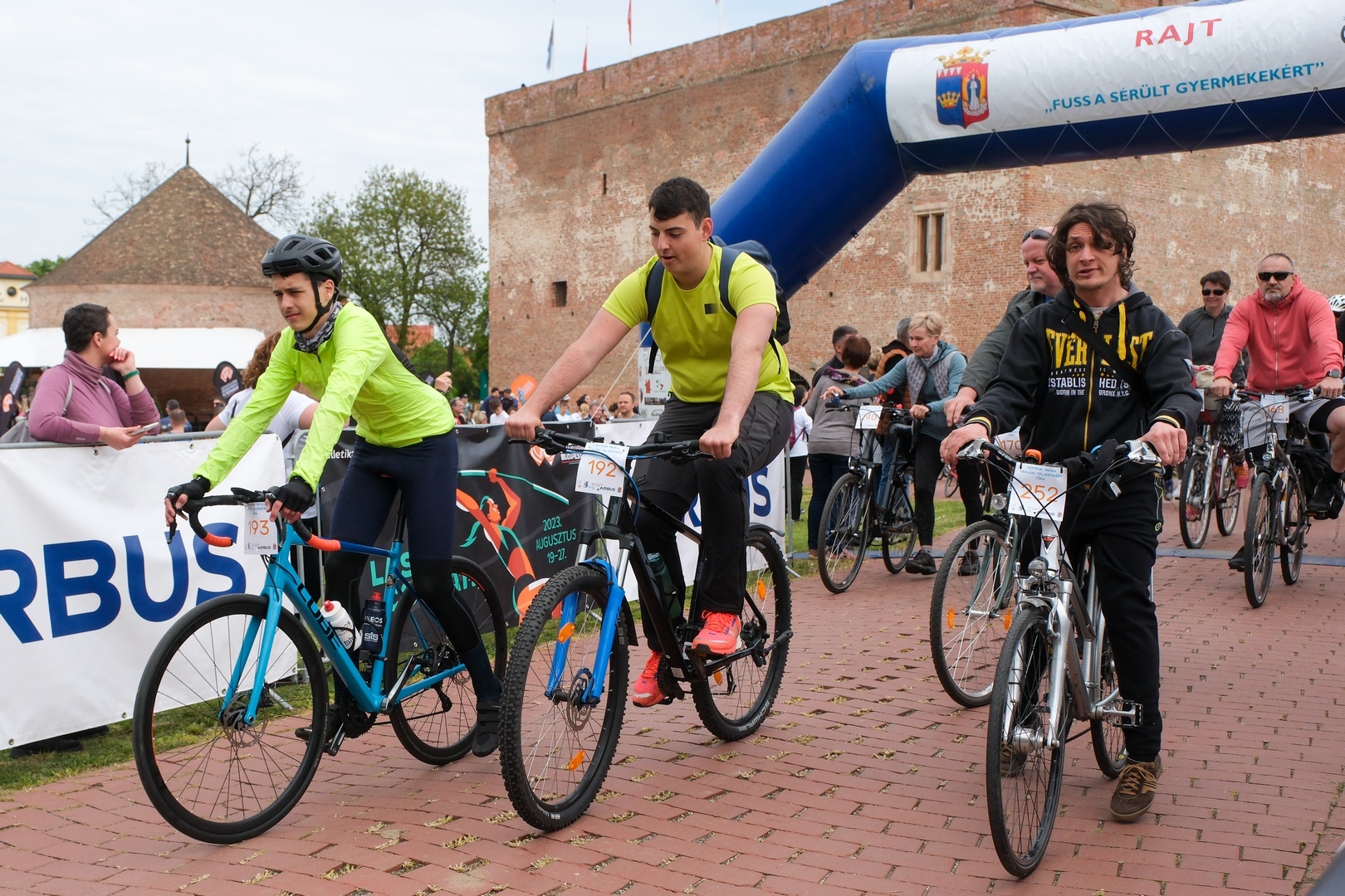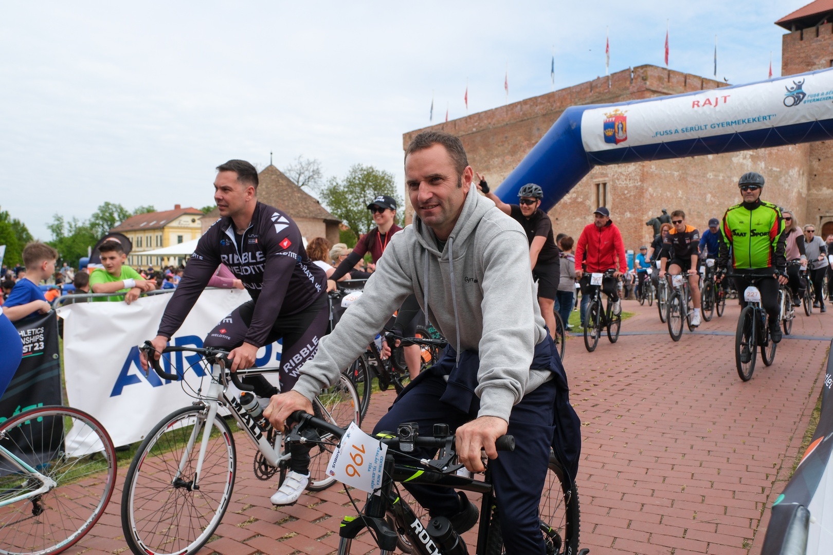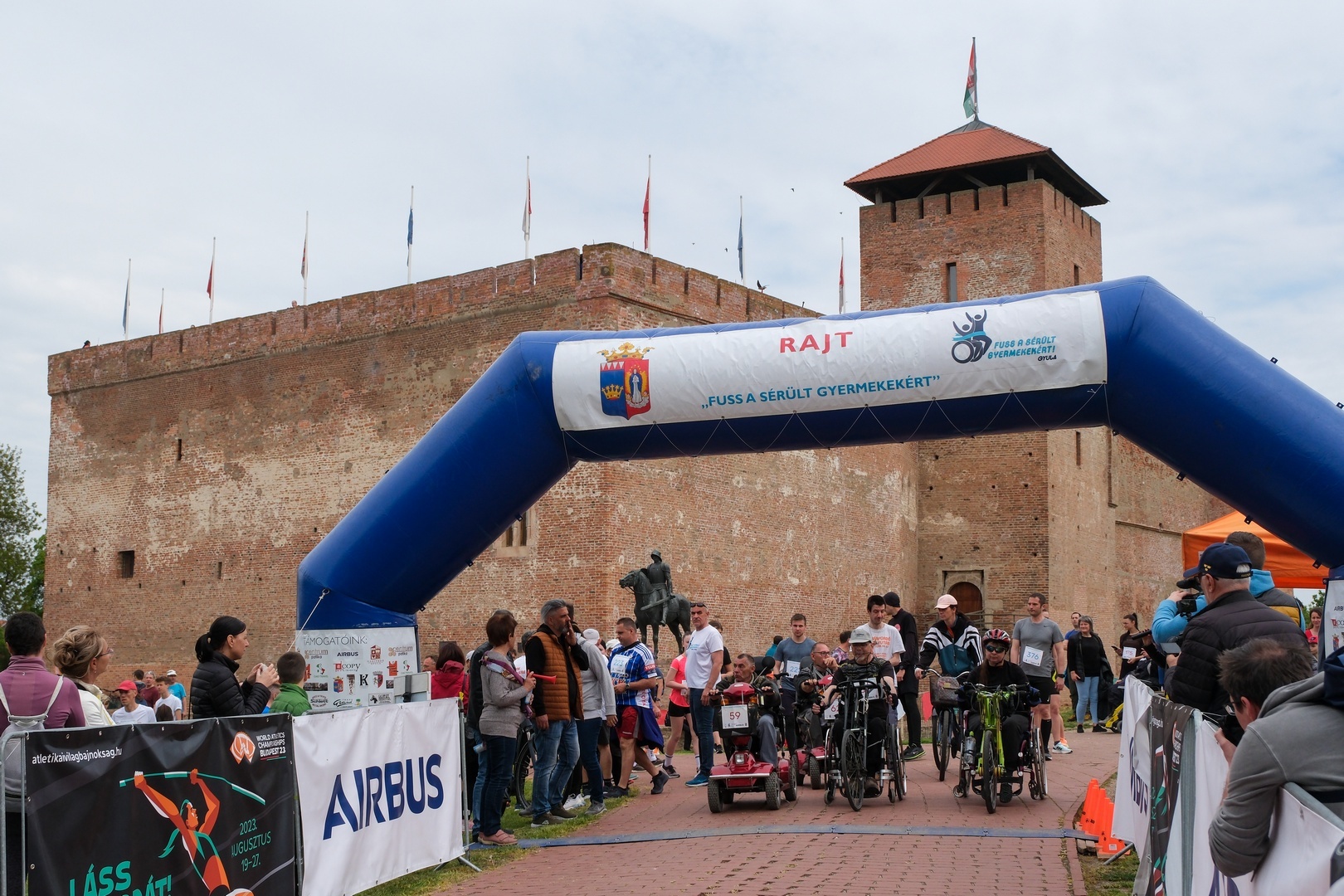 A kerékpárosok és kerekesszékesek rajtja a Fuss a sérült gyermekekért! versenyen