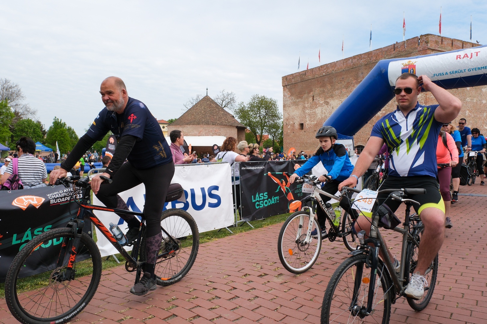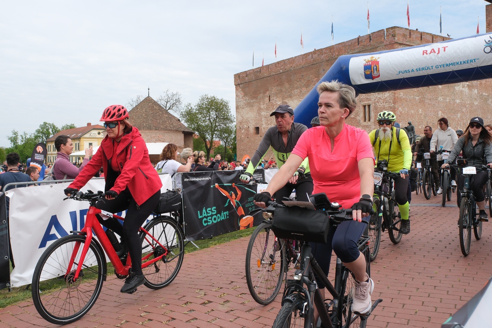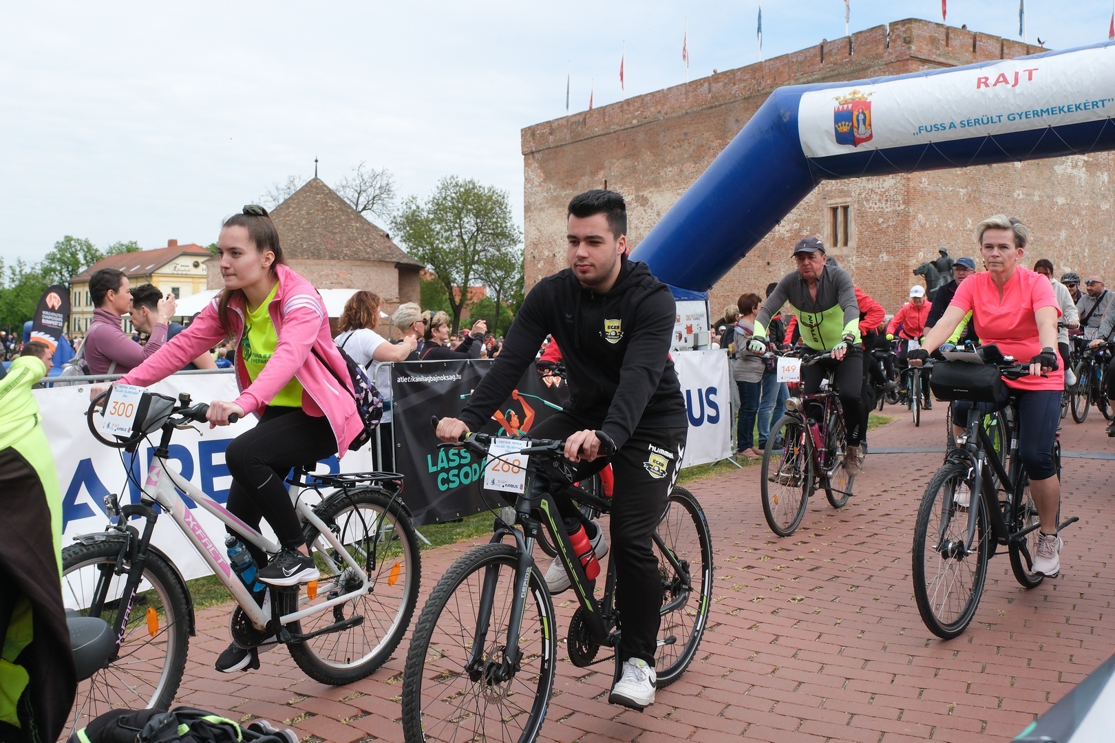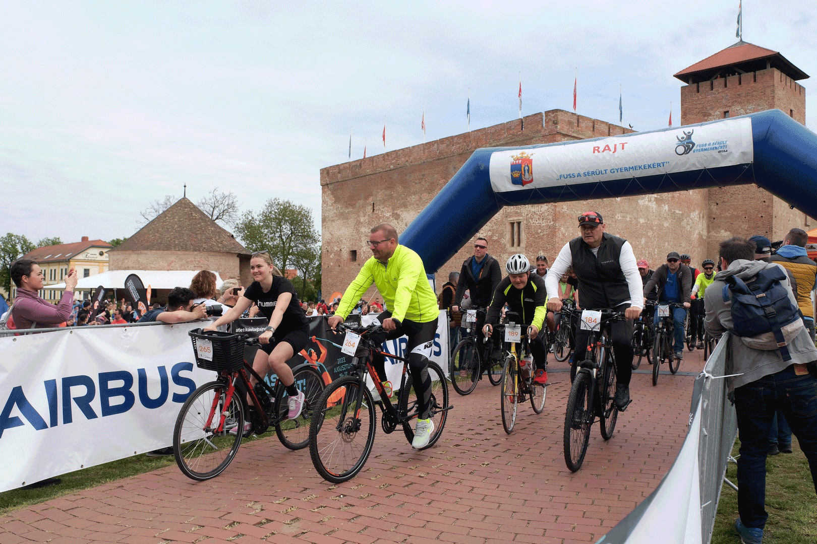 A kerékpárosok és kerekesszékesek rajtja a Fuss a sérült gyermekekért! versenyen