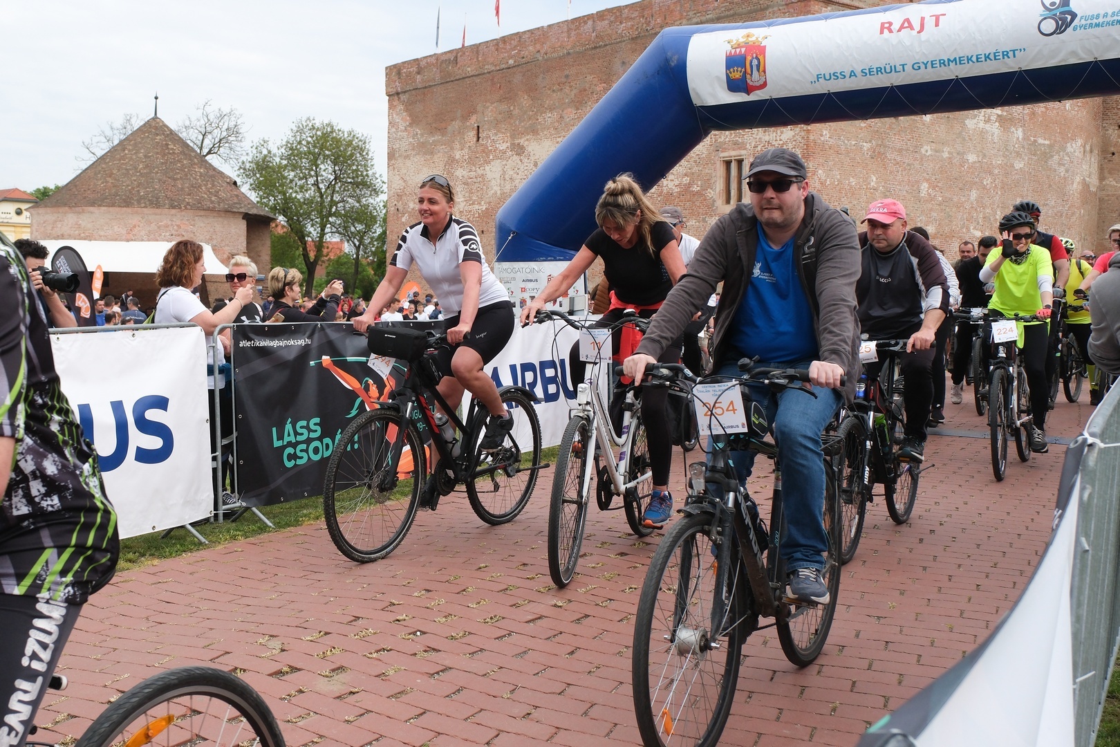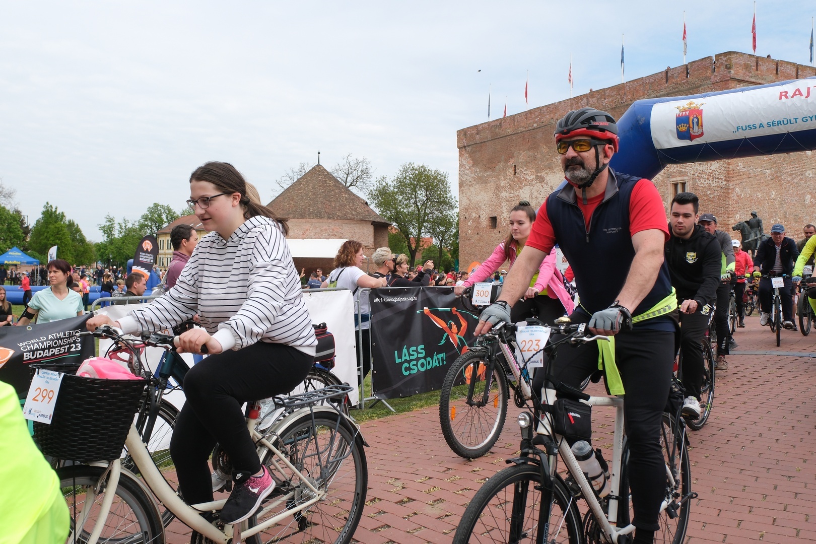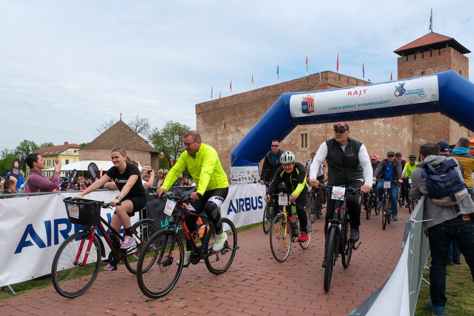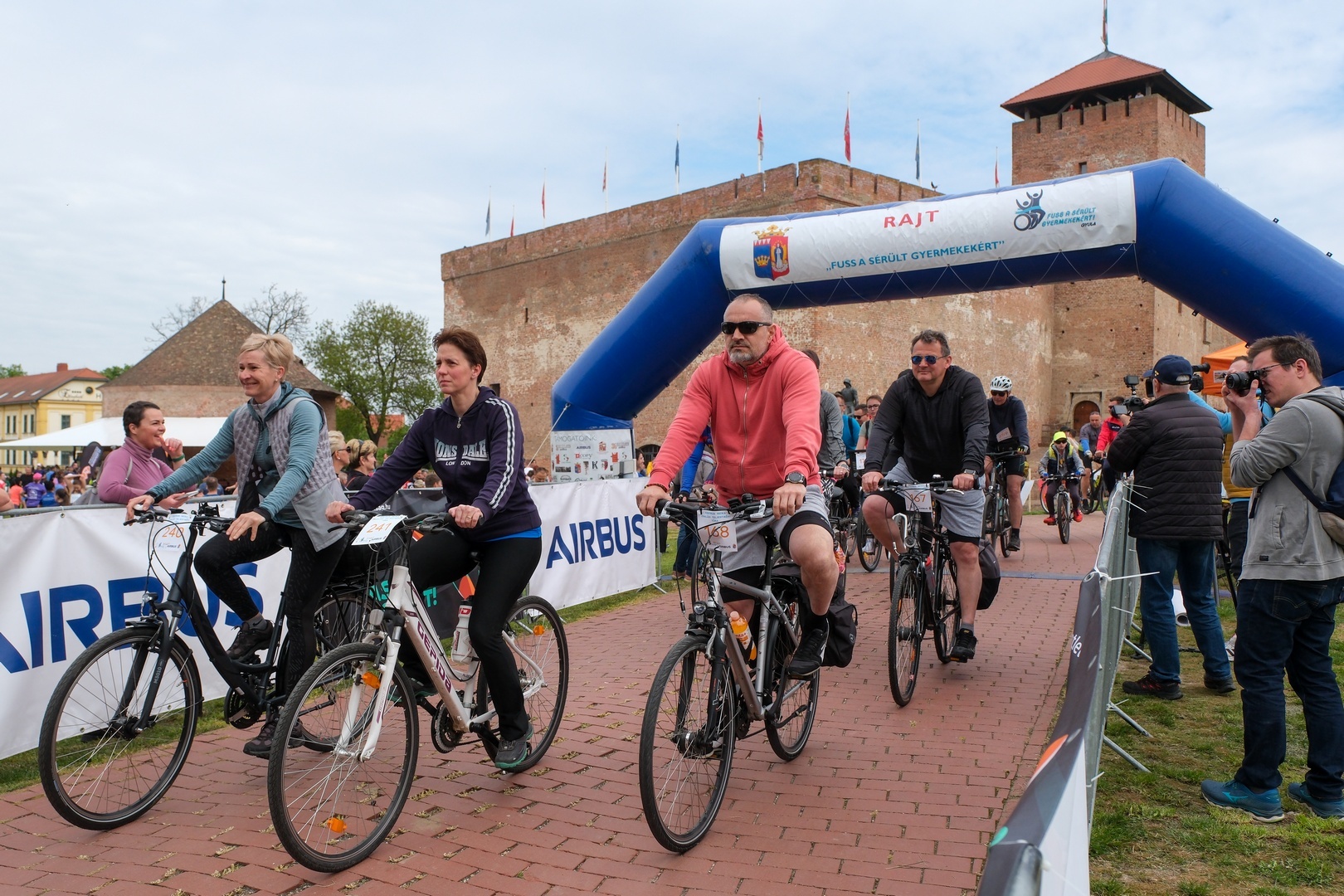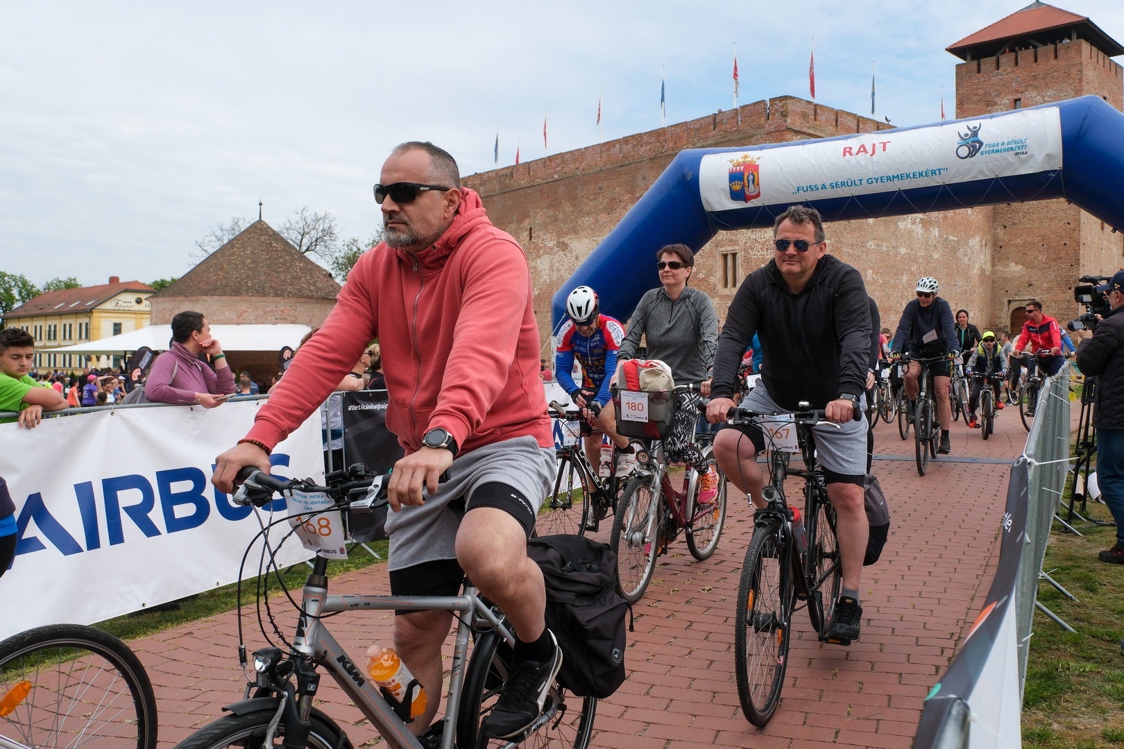 A kerékpárosok és kerekesszékesek rajtja a Fuss a sérült gyermekekért! versenyen