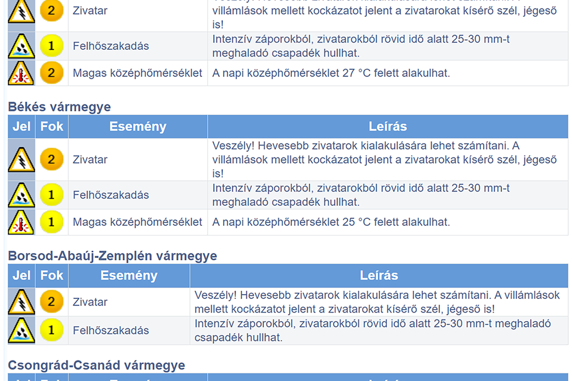 A zivatarok környezetében intenzív csapadék, felhőszakadás (>20-30 mm), nagyméretű jég (általában ~2-3 cm, helyenként >4-5 cm is előfordulhat), valamint viharos, erősen viharos széllökések (jellemzően ~60-80 km/h, helyenként >90-100 km/h is lehet) várhatók. A holnapi nap folyamán a piros riasztás kiadására is van esély, erre elsősorban a déli országrészben kell számítani.
