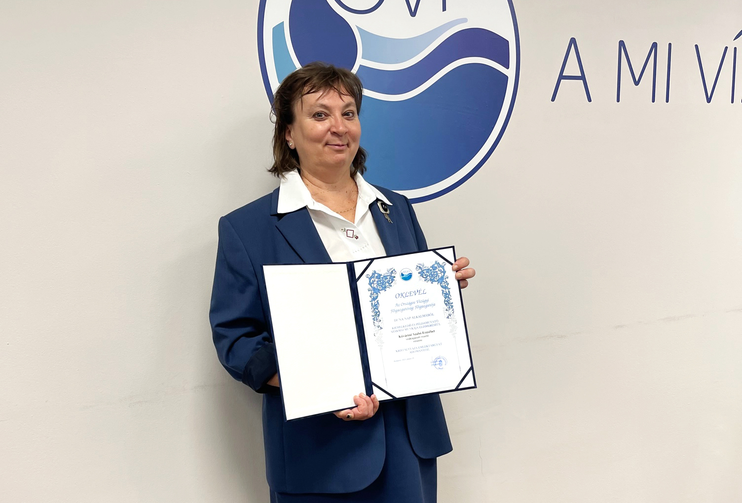 Főigazgatói kitüntetést vehetett át Kőváriné Szabó Erzsébet, a Körös-vidéki Vízügyi Igazgatóság (Kövizig) szakágazati vezetője Láng Istvántól, az Országos Vízügyi Főigazgatóság vezetőjétől június 29-én, a nemzetközi Duna-nap alkalmából.