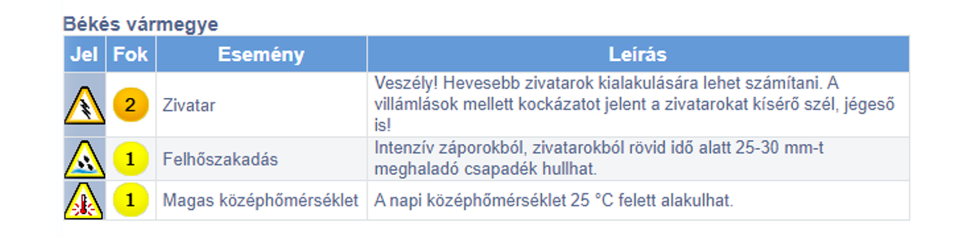 A legintenzívebb cellák környezetében nagy méretű jég (néhol >5 cm átmérőjű), szélvihar (80-100 km/h, helyenként >100 km/h), illetve felhőszakadás (~20-40, néhol >50 mm-t meghaladó csapadékmennyiség) is lehetséges.