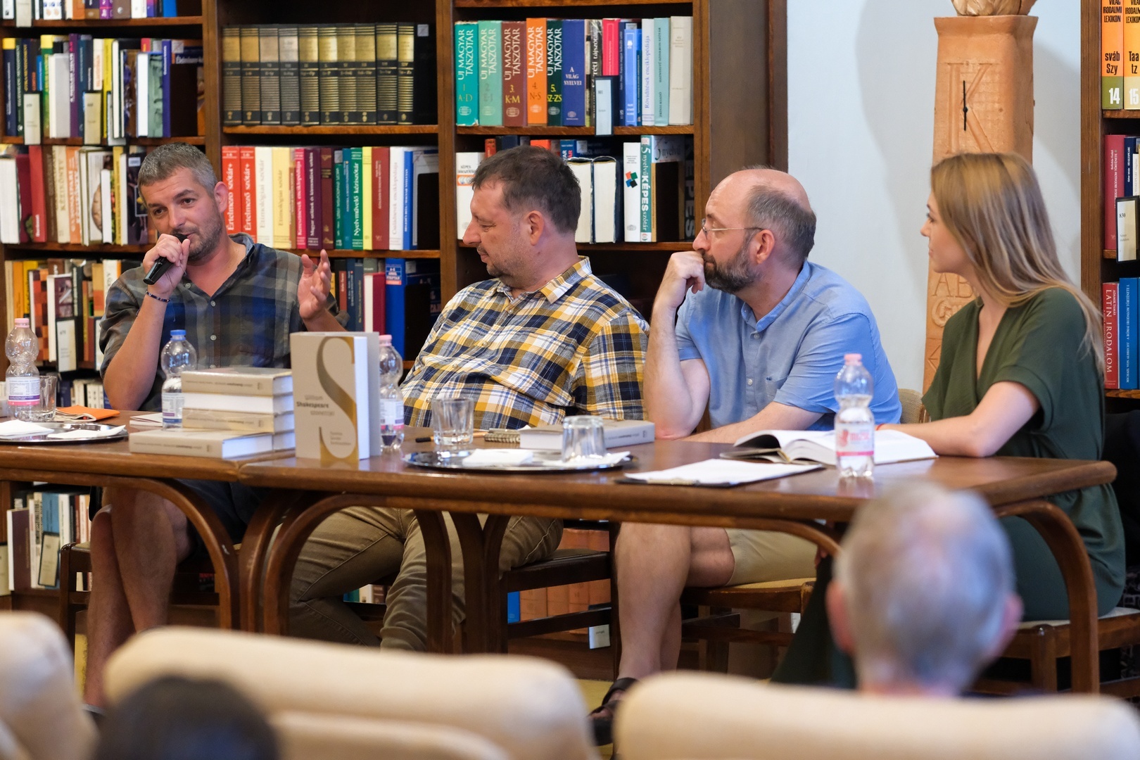 A házigazdák és a szervezők nevében a megjelenteket Dávid Péter tanár köszöntötte a gyulai könyvtár Simonyi-olvasótermében. Fazekas Sándor Shakespeare-fordító, irodalom- és drámatörténész a Kaposvári Egyetemről érkezett az említett vaskos művel Gyulára. Győrei Zsolt, aki már járt a Mogyoróssy-könyvtárban, sőt a Gyulai Várszínházzal is volt közös munkája, ezúttal A két szőrösfülű – Eustache Deschamps és Oswald von Wolkenstein válogatott versei című könyvszerkesztését hozta magával. Szálinger Balázs József Attila-díjas költő a kortárs magyar irodalom egyik meghatározó személyiségeként csatlakozott alkotótársaihoz, hogy trubadúrokról, Shakespeare-ről és a mai poétikáról beszélgessenek. Gulácsi Réka színész szonettfelolvasásaival segítette a társaságot.