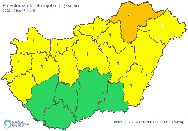 Az északkeleti tájakon késő délutántól heves zivatar előfordulására is van esély, nagyobb méretű (> 2-3 cm) jég és károkozó szélroham (> 90 km/h) kíséretében.