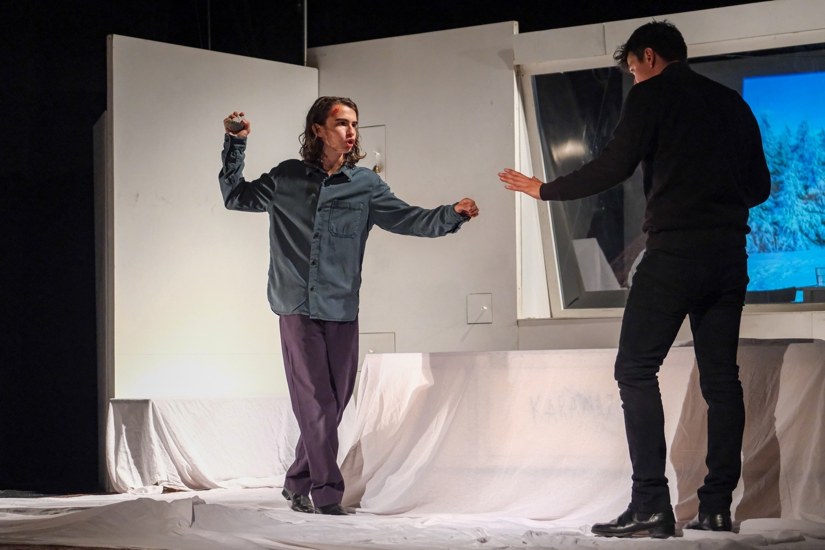 Az orosz tájhoz tartozó hótakaró mindössze egy fehér lepedő, amely tetszés szerint rendezhető. A játékteret első és hátsó részre osztó fal, ha kell, kávét ad, imádkozáskor ikont rejt, vagy szuvas fát, amely elnyeli a rossz pénzt, de segítséget is nyújt ahhoz, hogy ne kelljen élő kutyát besétáltatni a térbe: egyik ablaka (füle, fiókja) kinyílik, és az üveget helyettesítő monitoron megjelenik a négylábú kedvenc mozgóképe. Úgy tűnik, többfunkciós alkatrész ez, és hatásosan szolgálja a darabot, hiszen egy következő pillanatban köveket hajító gyerkőcök grundja, majd szentkép és tárgyalótermi szekció.