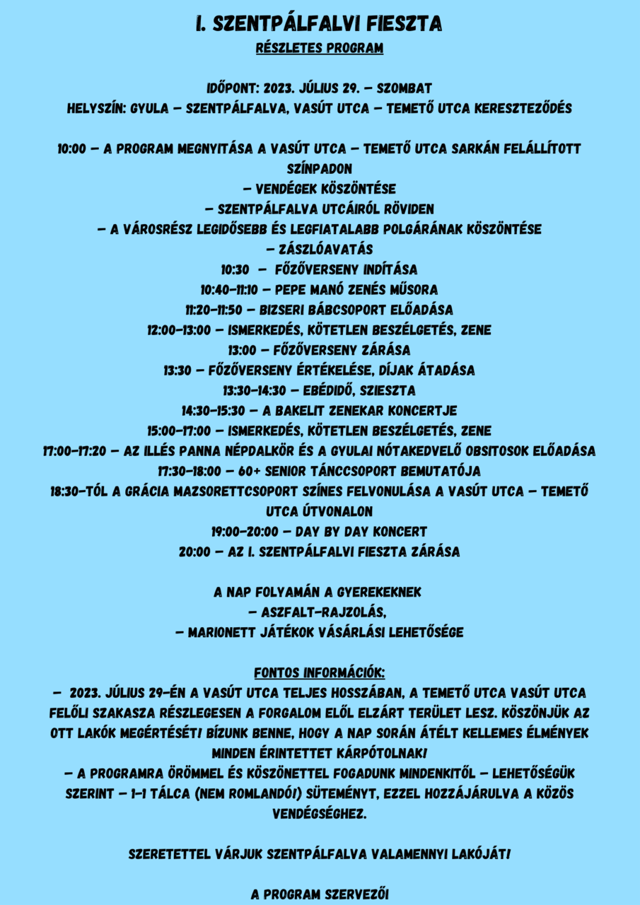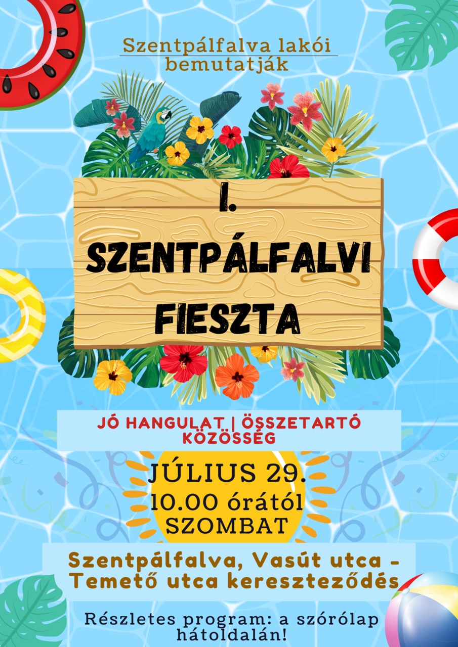 Szentpálfalvi Fieszta címmel rendeznek ma, július 29-én egész napos programsorozatot a városrész lakóinak. Az eseményt 10 órakor nyitják meg a Vasút utca–Temető utca találkozásánál felállított színpadon. A családbarát program a városrész leidősebb és legfiatalabb lakóinak a köszöntésével, illetve zászlóavatással indul. Este színes felvonulás és koncert zárja a napot – tájékoztatta lapunkat Alt Norbert, a településrész önkormányzati képviselője. Mutatjuk a részletes programot.