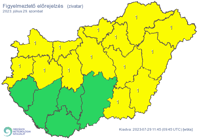Éjjel is főként az északi tájakon lehetnek zivatarok, majd hajnaltól, reggeltől északnyugat felől egy hidegfront hatására előbb a Dunántúlon lehet zivatarokra számítani, majd ezek napközben fokozatosan kelet felé helyeződnek. Este már inkább csak a keleti megyékben lehetnek zivatarok. A legfőbb veszélyforrás a felhőszakadás lesz, ugyanis nagy területen hullhat rövid idő alatt ~20-40 mm, néhol ennél több is előfordulhat. Ezen kívül a zivatarokat viharos széllökés (ált. 60-80 km/h, délkeleten, keleten akár >80 km/h) és jégeső (~1-3 cm) kísérheti.