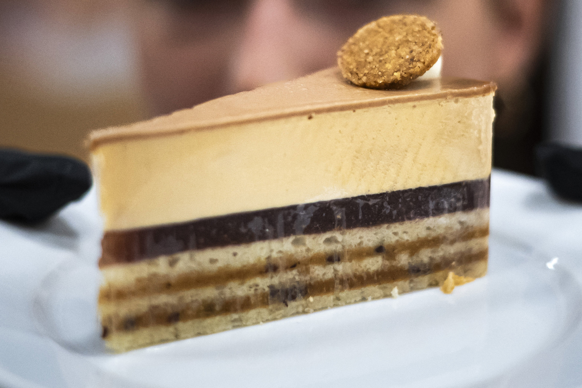 Elmondása szerint a Spicces füge respektus mandulalisztes vajas joconde felvertből, lágy sóskaramellás mousse-ból és diós-karamellás ropogósból épül fel, és kakaóbab töretet is tartalmaz. A tokaji aszús, meggyes fügezselé és az akácmézes tejcsokoládé tükörzselé által biztosított ízeket akácmézes fehércsokis ganache és diós sablé korong koronázza meg.
