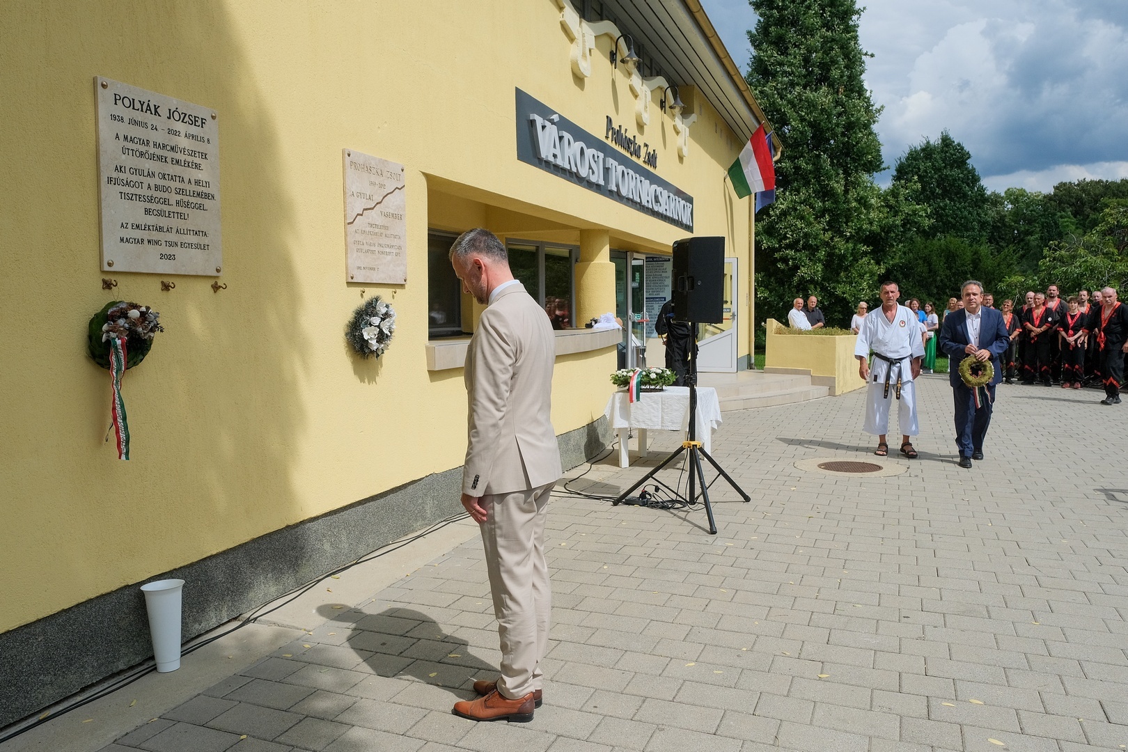 Emléktáblát avattak Polyák József, a japán harcművészetek magyarországi meghonosítója tiszteletére csütörtökön Gyulán, a Prohászka Zsolt Városi Tornacsarnok homlokzatán.
