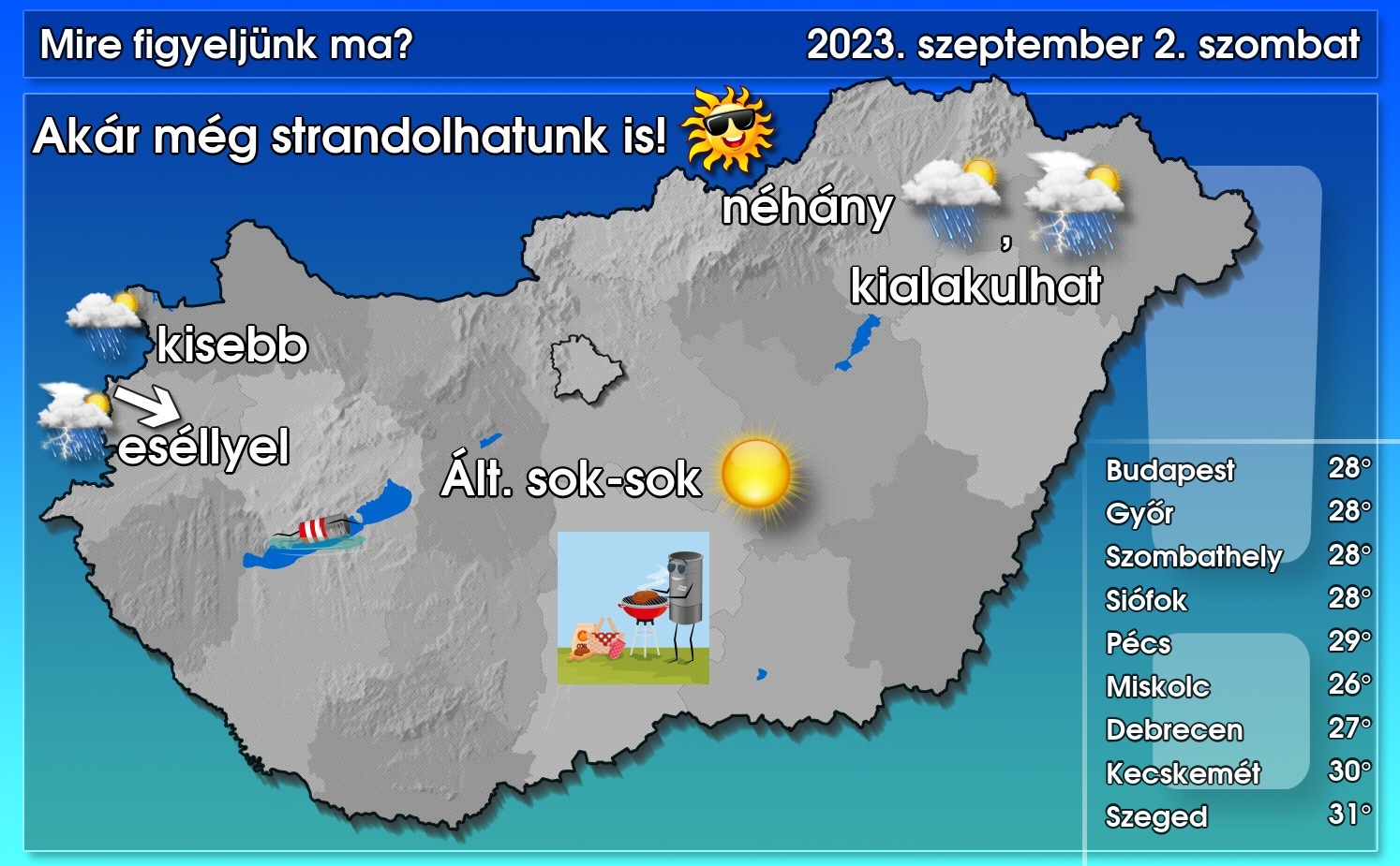Napos idő várható, többnyire kevés fátyol- és gomolyfelhővel, ugyanakkor nagyobb eséllyel az északkeleti tájakon magasabbra törhetnek a gomolyok, és ott néhány zápor, zivatar is kialakulhat. Kisebb eséllyel az Alpokalja és a Bakony környékén is előfordulhat egy-egy csapadékgóc. A délnyugati szél az északkeleti harmadban helyenként megélénkül. A hőmérséklet 25 és 31 fok között tetőzik, az Alföldön lesz a melegebb.