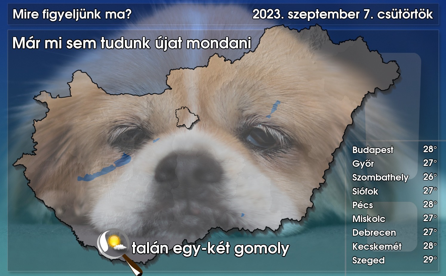 Nagy változás továbbra sem lesz, ma már tényleg nagyítóval kereshetjük a felhőket, a légmozgás is csak kevés helyen élénkülhet meg. A hőmérséklet 26 és 30 fok között tetőzik.
