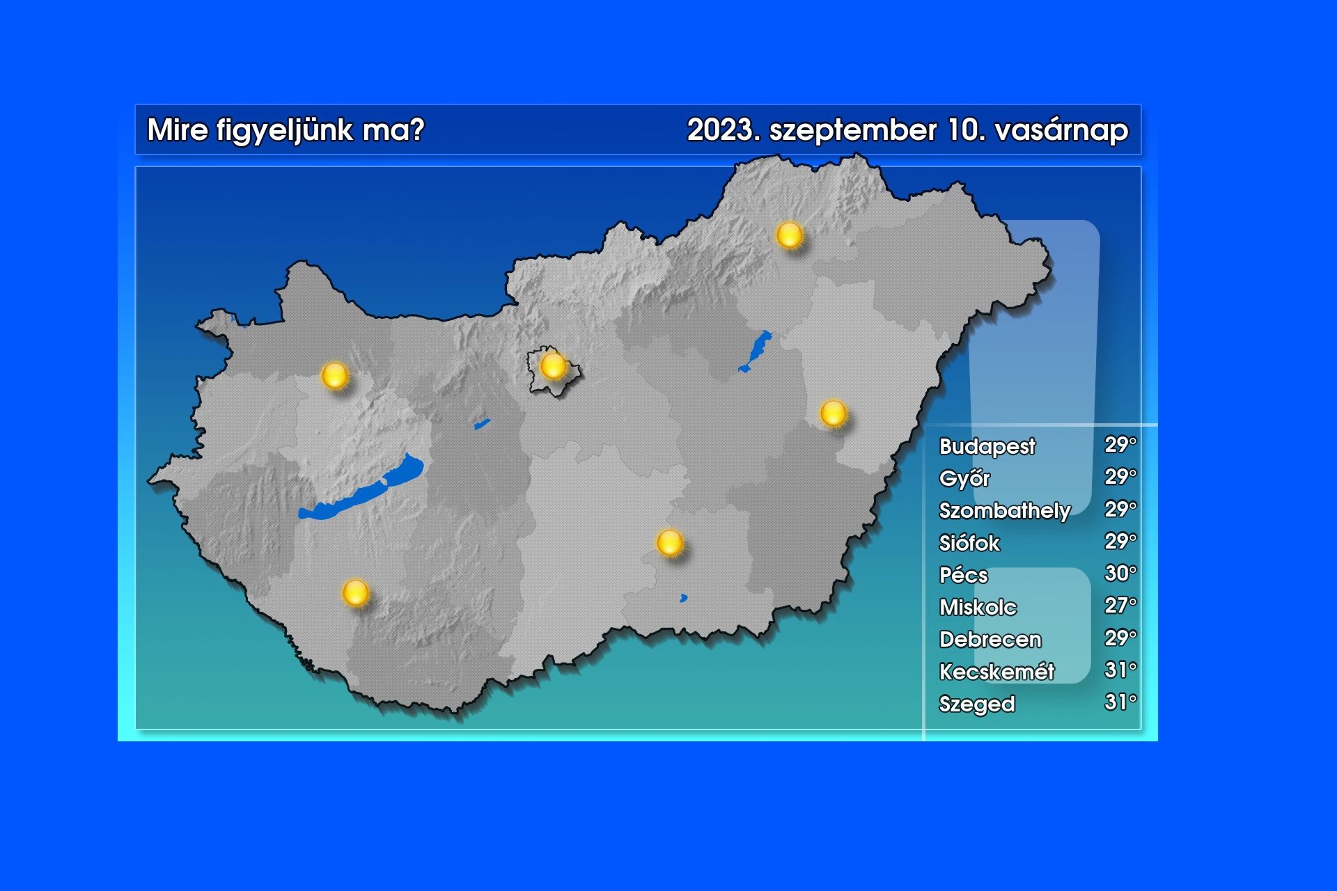 Jó reggelt kívánunk! Időjárási szempontból csak egyetlen dologra érdemes figyelni: a déli órák környékén erős UV-B sugárzás várható. Az előző napokhoz képest sem az időjárás jellegében sem a hőmérsékletében nem lesz változás – írta közösségi oldalán az Országos Meteorológiai Szolgálat.