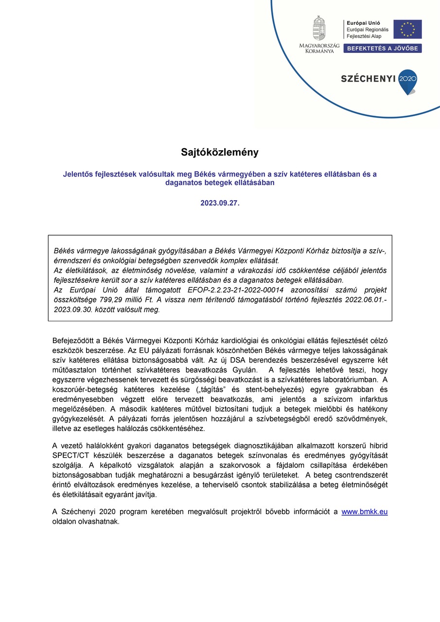 Jelentős fejlesztések valósultak meg Békés vármegyében a szív katéteres ellátásban és a daganatos betegek ellátásában