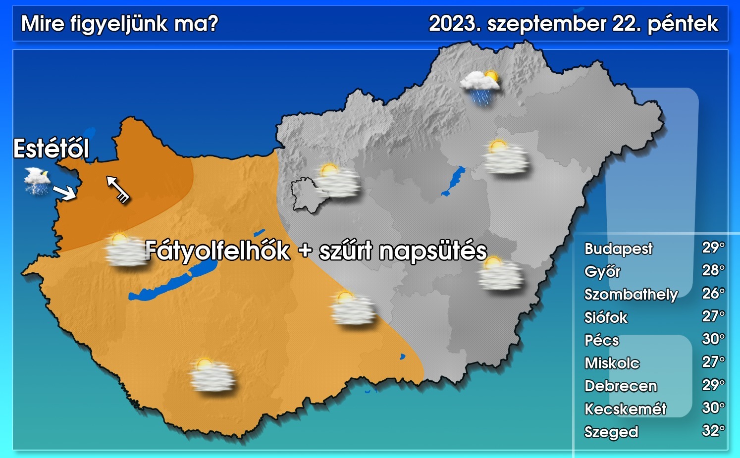 Ma még viszonylag nyugodt idő várható. Az ország nagyobb részén fátyolfelhők szűrik a napsütést. A nap nagy részében számottevő csapadék nem valószínű. Az esti óráktól nyugat felől vastagabb felhők érkeznek, így a csapadékhajlam is megnő. A déli, délnyugati szél nagy területen lesz élénk, erős.