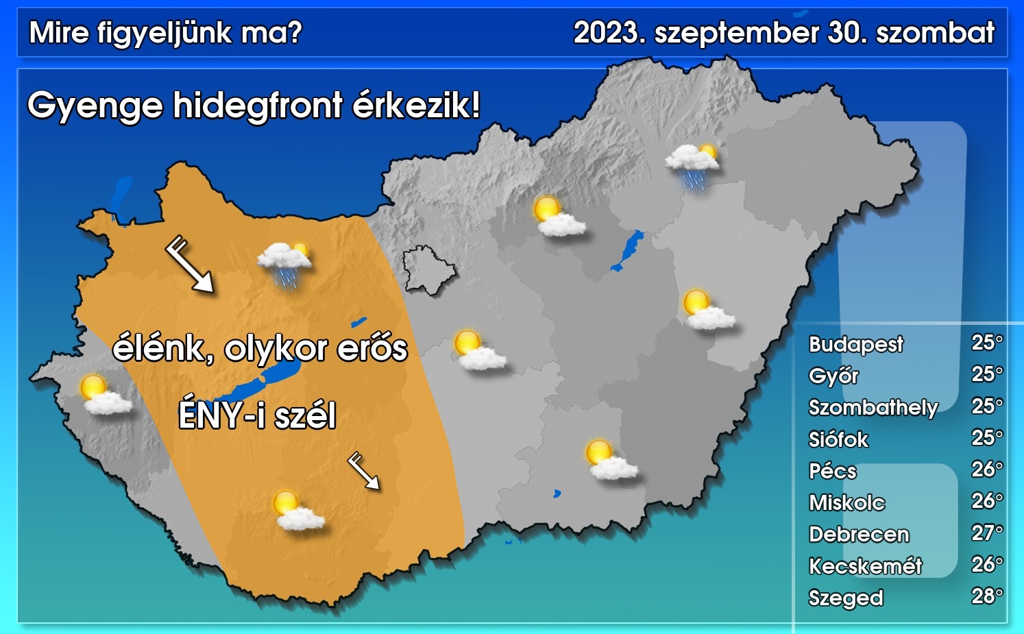 Ma egy gyenge hidegfront szakadozott felhőzete halad át felettünk északnyugatról délkelet felé haladva, így többórás napsütésre is számíthatunk. Csapadék az ország nagy részén nem valószínű, legfeljebb elvétve alakulhat ki gyenge eső, záporeső. Az északnyugatira forduló szél megélénkül, helyenként megerősödik. A mai maximum hőmérséklet csak pár fokkal esik vissza, 22 és 28 fok közötti értékeket mérhetünk.