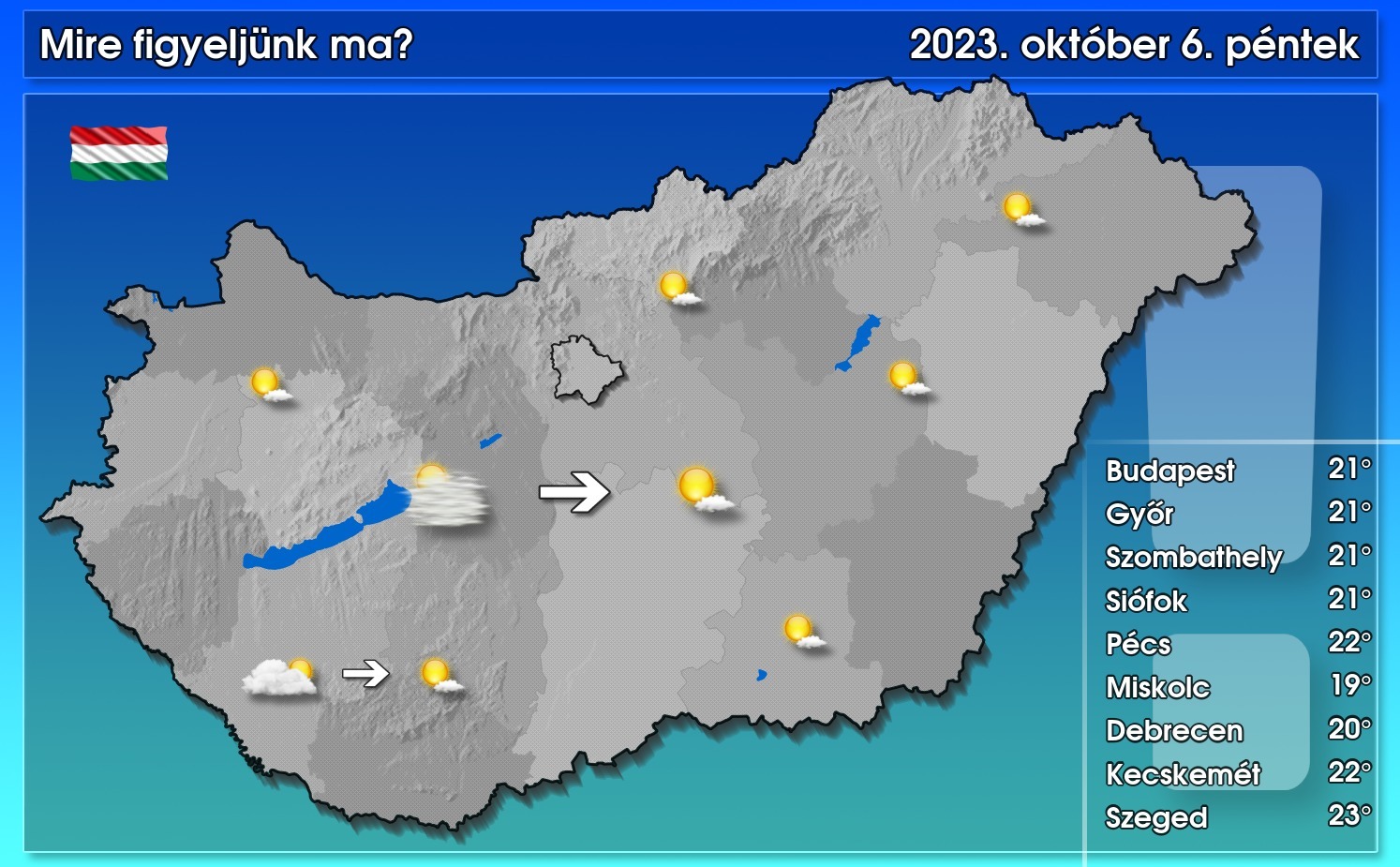 A következő órákban északnyugat felől csökken a fátyolfelhőzet, és a délnyugati részekről is levonul a vastagabb felhőtakaró. Összességében sok napsütésben lesz részünk, legfeljebb kevés fátyol- és gomolyfelhő lehet az égen, amelyekből csapadék nem várható. A mai csúcsérték – az előző napokhoz hasonlóan – általában 18 és 23 fok között alakul.